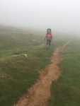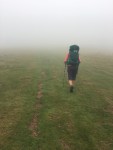 After enjoying the fresh, cool morning air and relatively flat walking, the Camino veered right off the paved road into the grass pasture marked initially by only a sign with a map (a welcome addition that was not there in 2012). The slightly worn grass path suddenly became very steep and deteriorated into a rocky wash. It eventually morphed into a narrow dirt path, growing wider until it became a narrow farm dirt road. The fog had in the meantime rolled in and the scenery around us was no longer visible. We continued along the road which varied from flat to slight inclinations upward until we reached the Fontaine de Roland at around 10:00 a.m. which marks the entry into 🇪🇸 Spain.