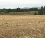 Today was much of what we enjoy about the Camino. The rolling farmland of Rioja, extending out in all directions from a winding seemingly endless Camino soothed the senses. The dark green rows of fruit filled grape vines randomly patched among already harvested fields of grain and occasional, occurring lighter green olive orchards formed a comforting quilt. The sounds of rustling water in the open irrigation trenches, the gentle rhythm of crunching footsteps and an occasional dog bark punctuated the soundless void that was relaxing and meditative and sustaining.