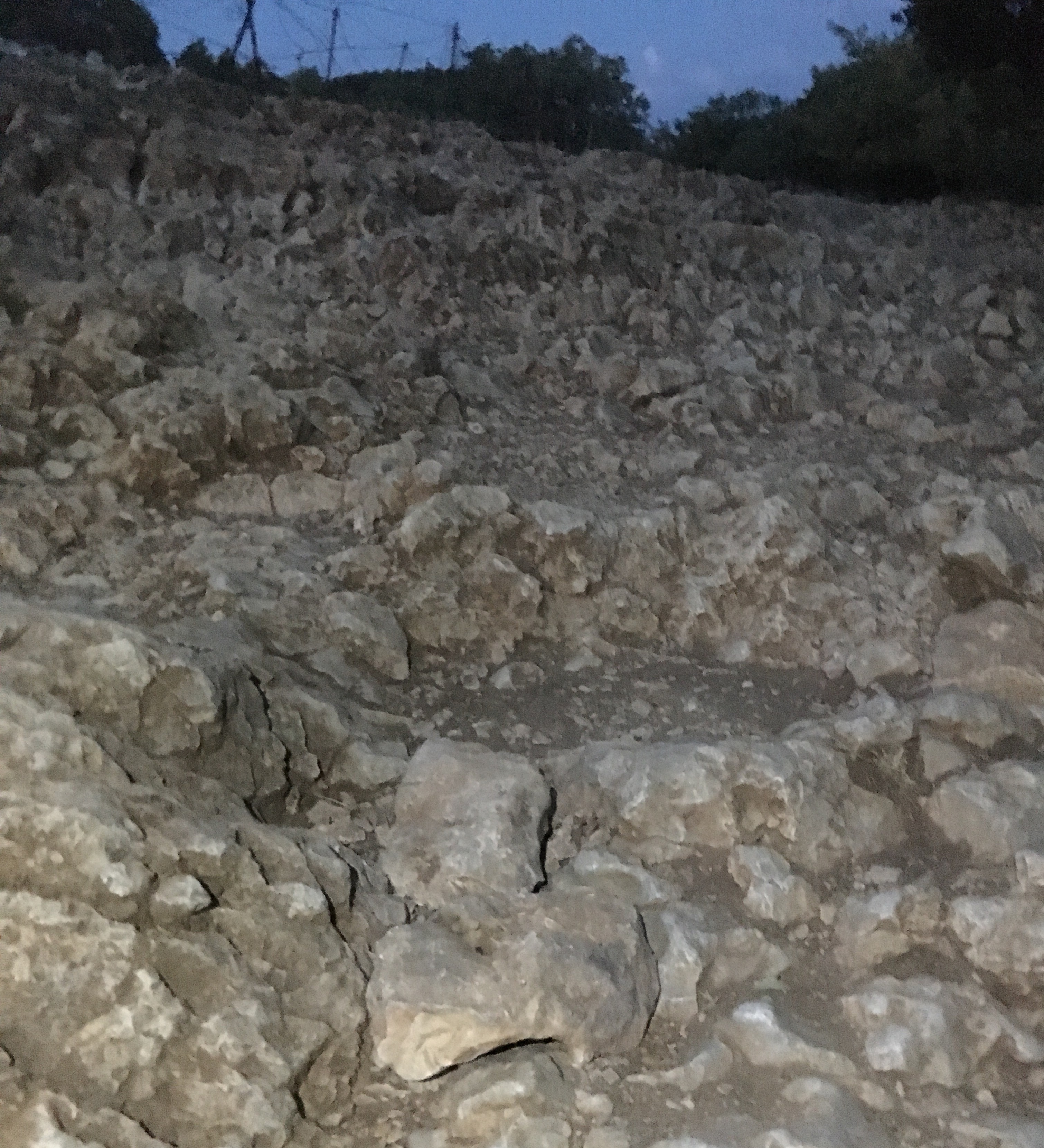 Next Image IMG_9915 Walking on this rocky “path” was very difficult! Note barbed wire at top of image, bordering army base.