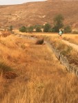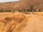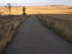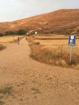 At the bottom, the path became dirt/gravel again and continued through shadeless wheat fields. We paused a few minutes more after 4.5 miles into our walk at Fuente al Pioja (flea’s fountain) where local fellows regularly offer coffee, fruit and other snacks along a shady picnic area. A natural spring offers untreated water, though locals say it is safe to drink. No locals were there this morning and we didn’t want to test the water and we’re no fan of fleas, so we moved on and joined a paved road for a few minutes then followed the Camino marker onto a dirt path that took us past San Nicolás Chapel.