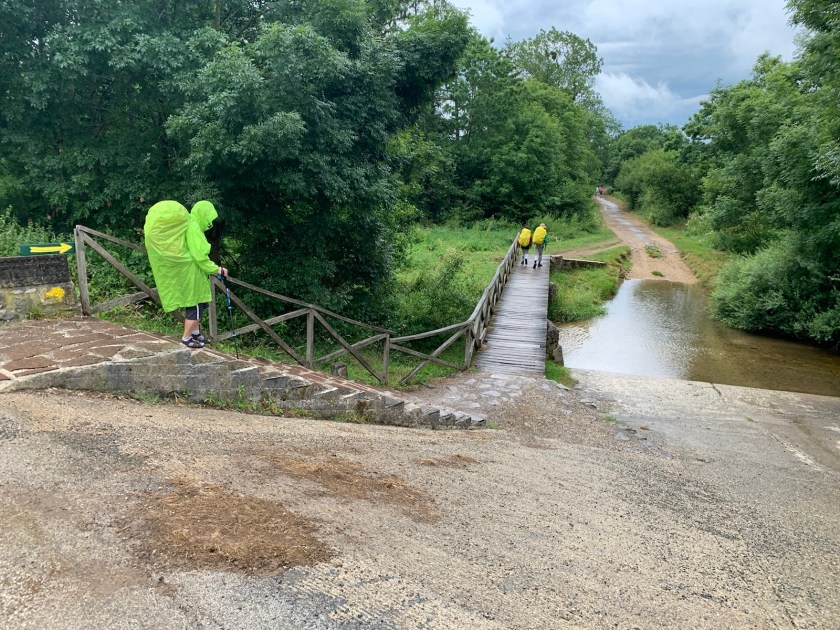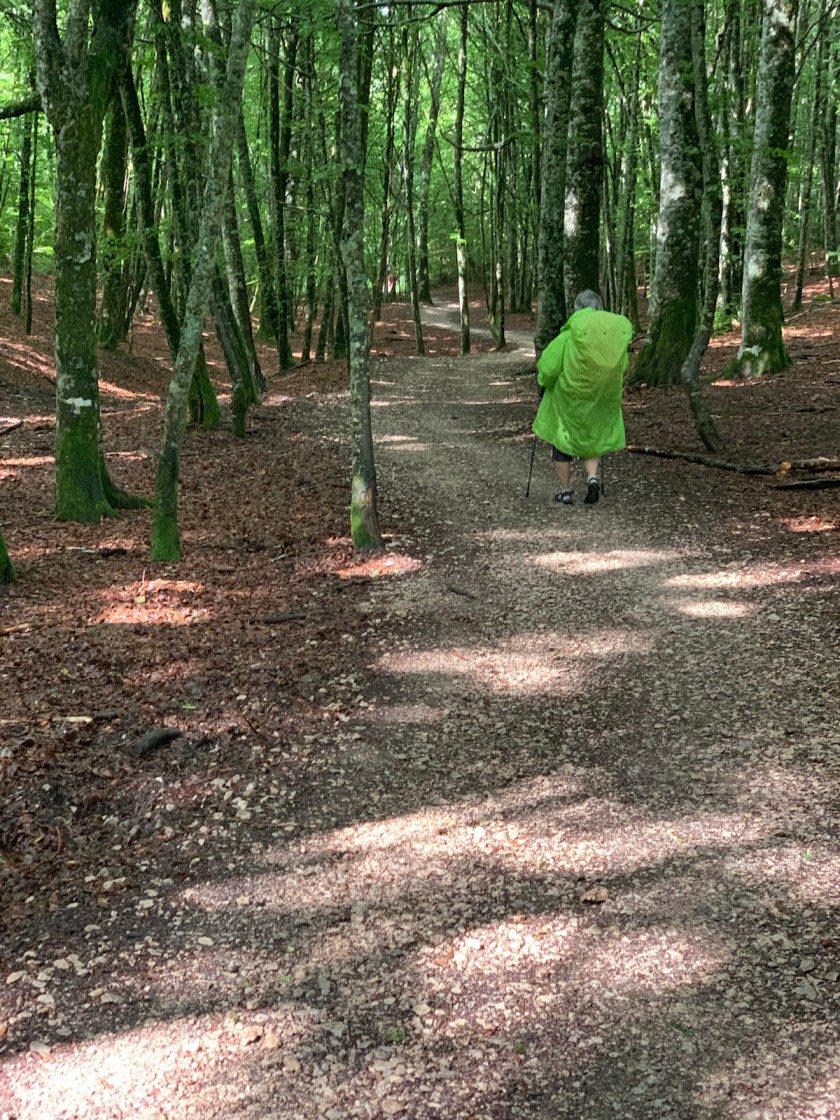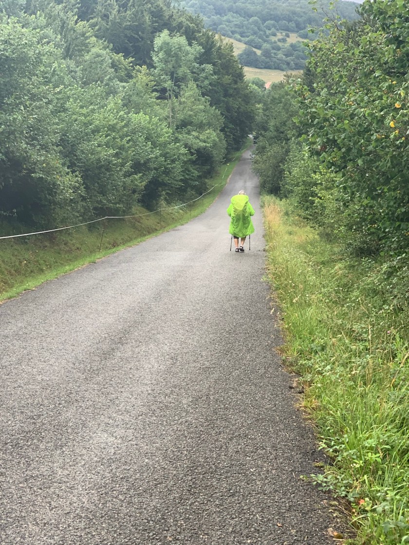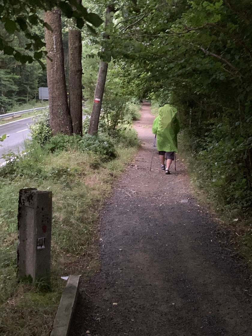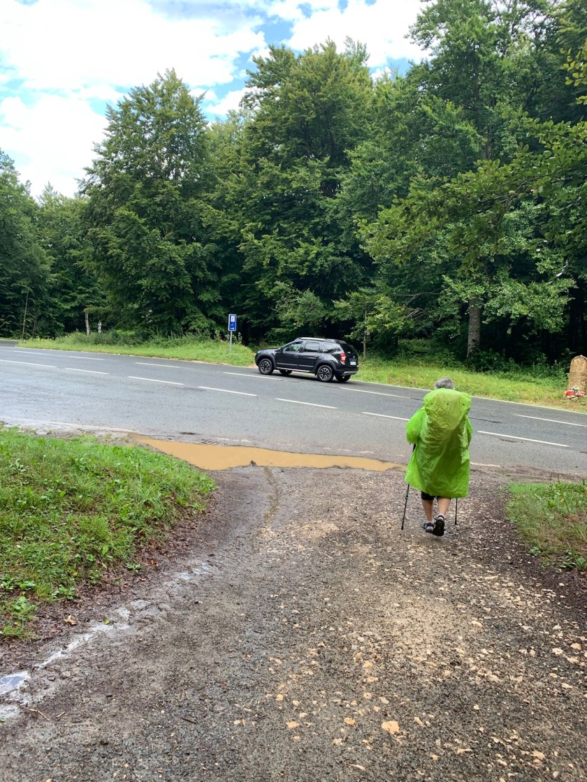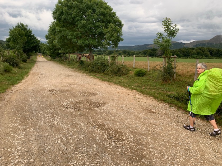 After cappuccino and toast (cafe con leche) we continued walking thru the village and for about 5 minutes, we were confronted by thunder, lightning, a light drizzle, hail, but thankfully, no swarming locusts. About 3 miles later, in the booming metropolis of Epinal (pop.249) we stopped again at a small bar for more cafe con leche and to avoid another passing (we hoped) storm.