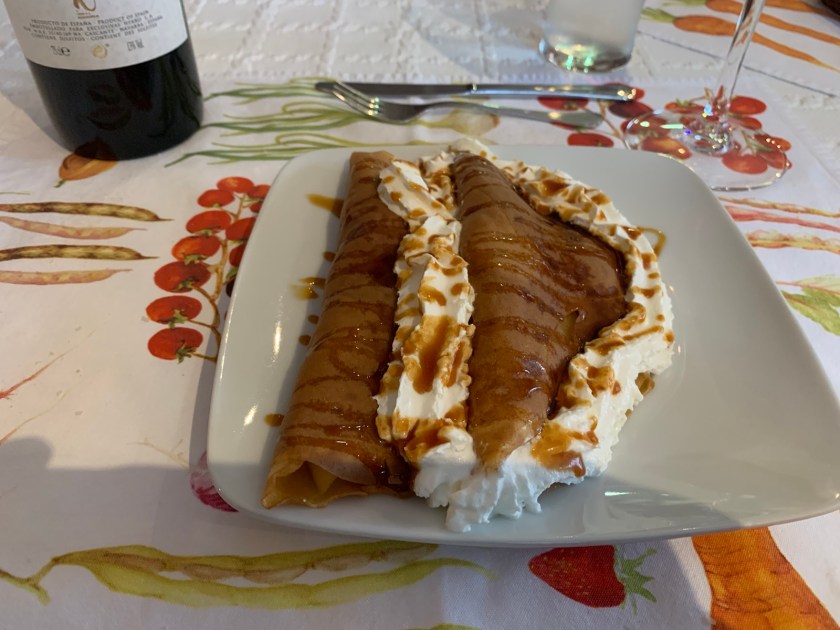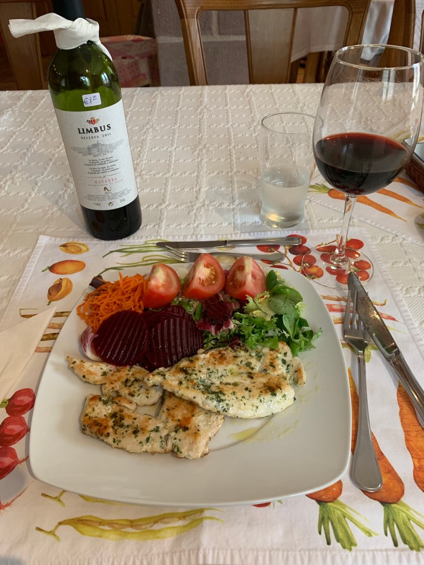 Dinner (12€/) was exceptional and homemade this afternoon by Elsa. Spinach in puff pastry, marinated chicken breasts w/ fresh, crisp garden salad,