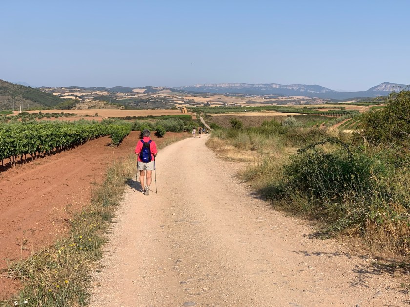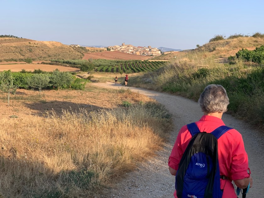 Vineyards, an occasional small olive grove and fields of grain fill the approaching valley. The Camino path winds through the valley like a snake.