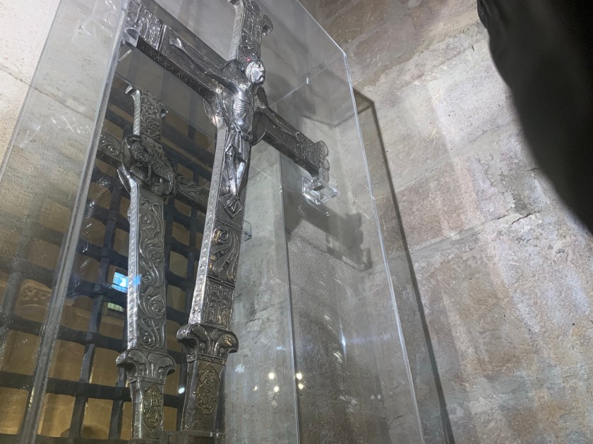 We visited the small 12th century Iglesia de San Andrés on the square and finagled the camera through a metal grated encasement to capture an image of the silver processional crucifix from the year 1200, which is displayed proudly on the sanctuary wall. We also had our credentials stamped by the attending priest.