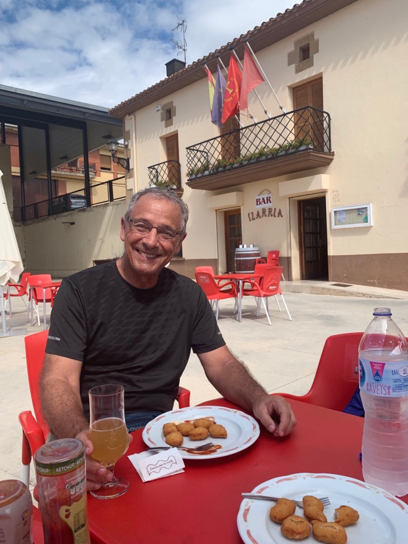 It being noon, by now, we continued further up the hillside to the only bar in town and ordered chicken nuggets for Jim’s birthday lunch a la Camino.