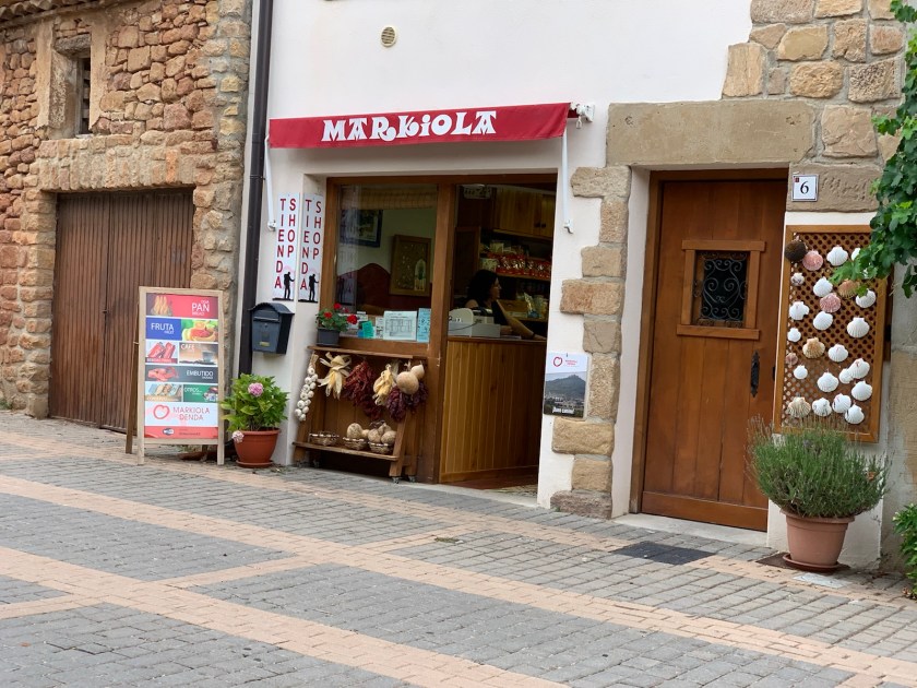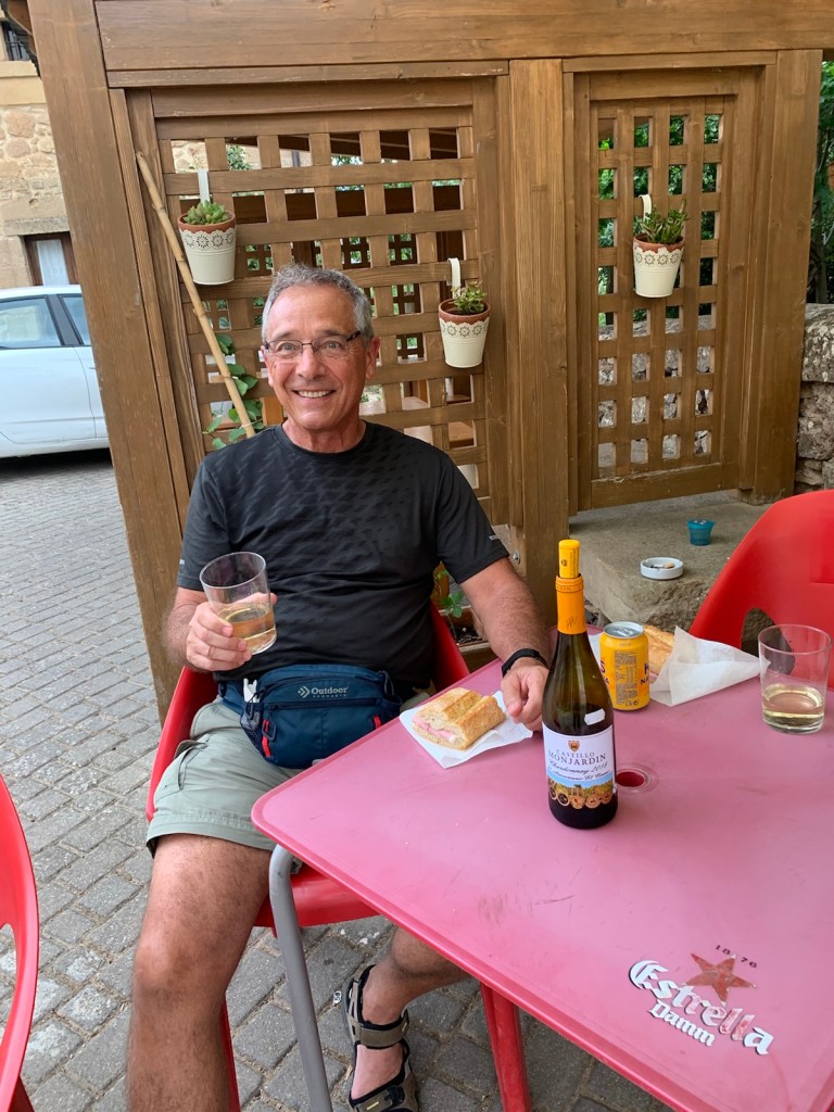 A pilgrims dinner was available in the village bar at 7:00 tonight. We were hungry at 5:30 and the bar kitchen was closed until 7:00. So we went to a small grocery store, assisted by the consumer oriented owner, bought a half baguette, some mayo and mustard packets, a pre-packed ham slices (5) and a bottle of local Chardonnay (from the closed bodega we couldn’t access today). The store owner sliced the bread to our sizes, cut open the blister pack of ham, opened the bottle of wine and loaned us two wine glasses.