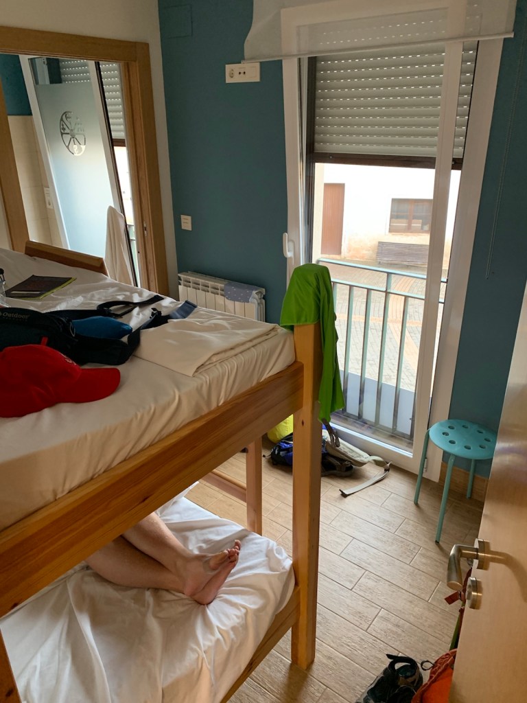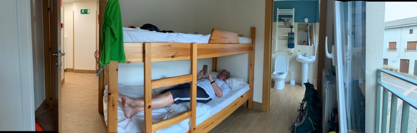 We have stayed in albergues with the bunk bed arrangement before, but only do it if other options are not available. Normally we stay in a double room with ensuite bathroom, like a typical hotel room. Sharing a bathroom/shower with others is not a problem, only a little inconvenient. Double rooms with bath ( habitacion doble con baño) can be found in pencions, casa rurals, hostals and even most albergues at a cost slightly more than two single bunk beds in a dorm arrangement. Consequently, whenever available, we opt for the double room with bath. For example, we described above our accommodations for tonight which is 40€. Last night in Estella we stayed at ground zero for the biggest festival of the year, watched festivities from our room balcony, amenities like extra towels, soap, shampoo, drinking glasses, chairs to sit in, plenty of room at 45€.