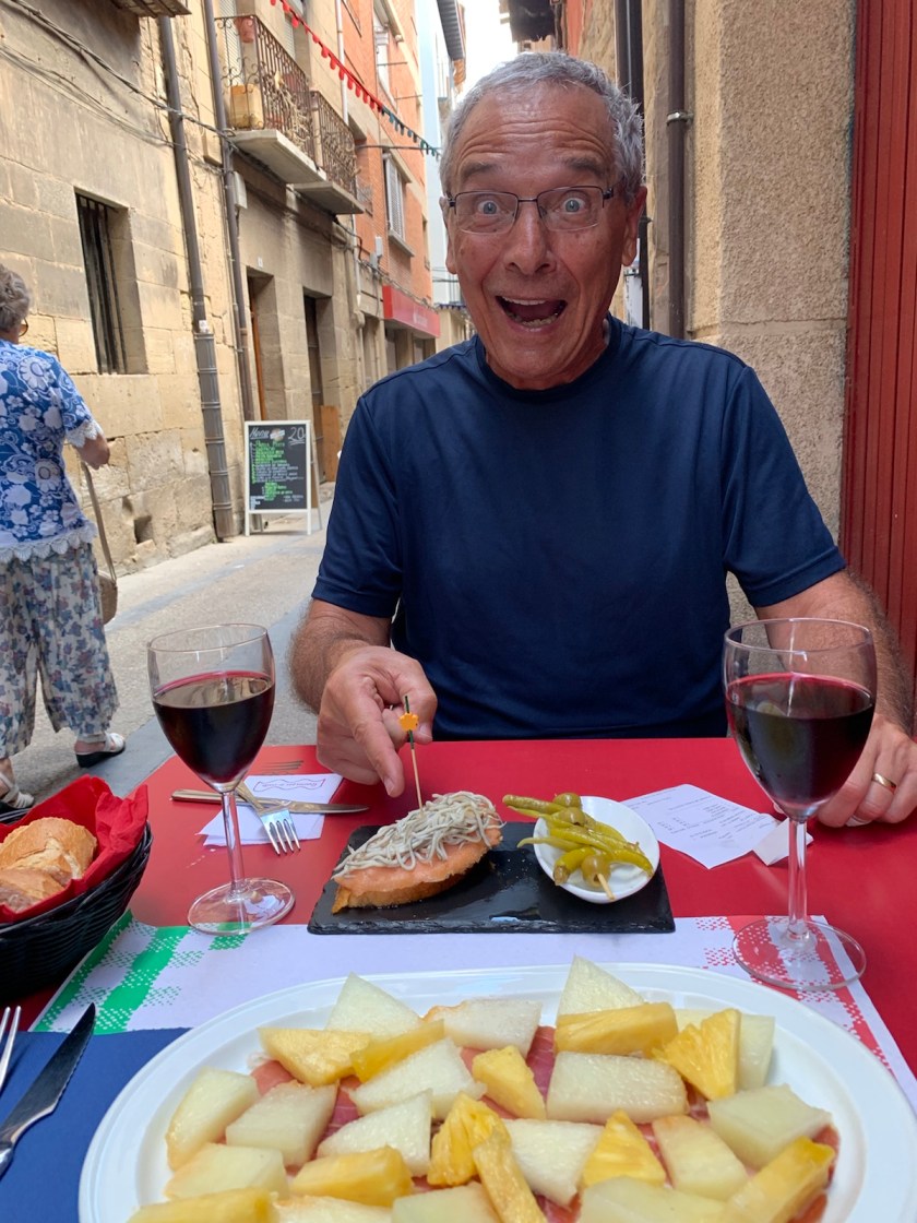 Linda shared two pintxos with Jim and then opted for a nice plate of melon, pineapple and jamon (ham) and decided not to indulge in Jim’s second set of pintxos, baby eel on salmon and pickled olives/hot peppers.