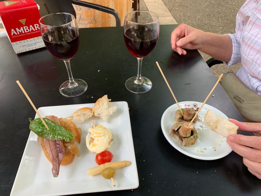 So, for lunch we went bar hoppin’ for pintxos. Without the advantage of language, selecting a pintxo is based on visual appeal and an occasional recognized, preferred food component. But like a box of chocolates, you are never sure what you’re gonna’ get until you bite, chew and swallow.