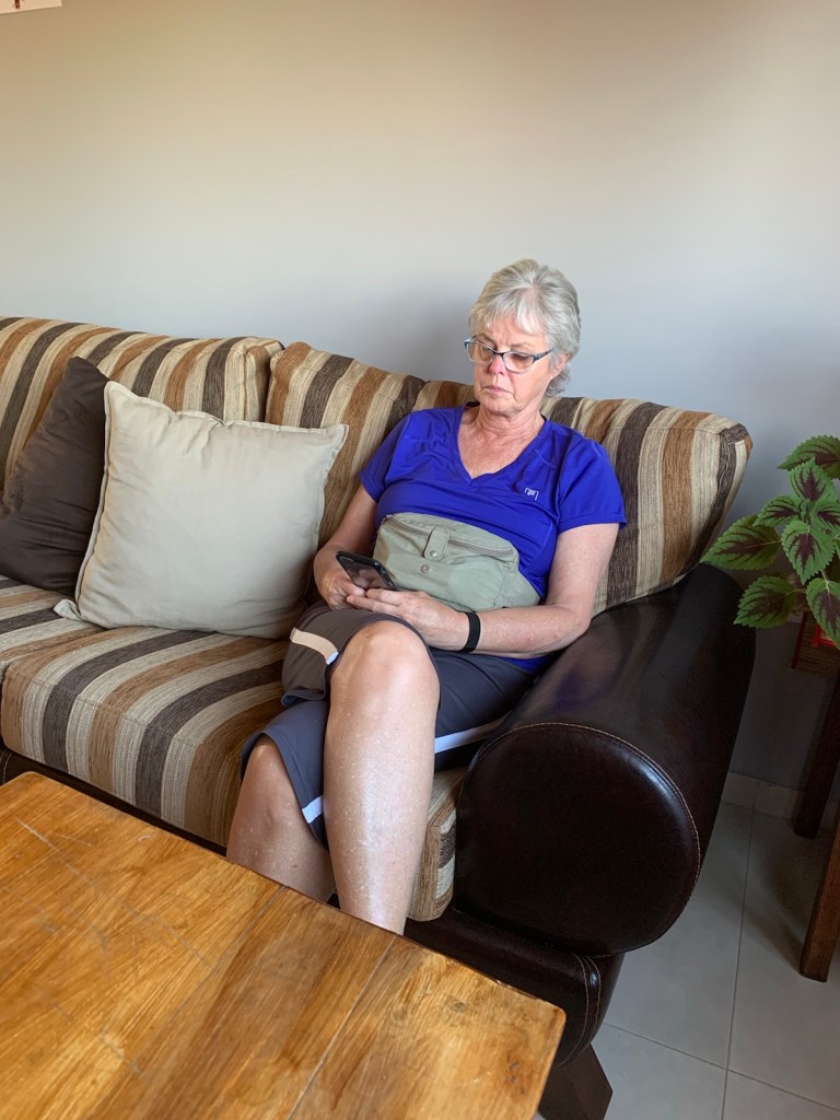 Linda reading on a comfortable sofa in the albergue “zona de lectura”, reading zone… shhh!