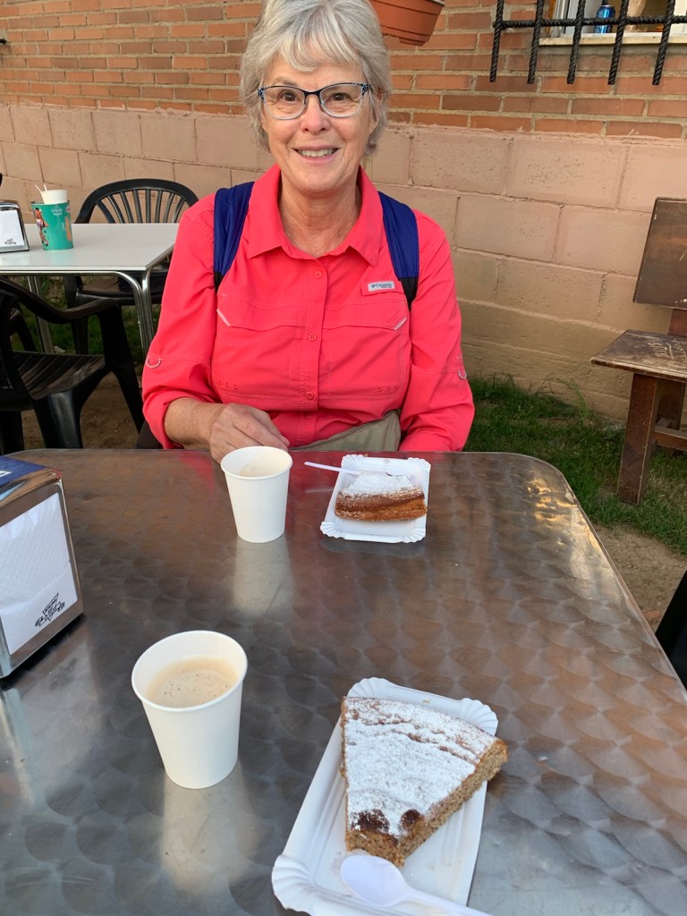 We stopped in Valverde del la Virgen at a new store that we don’t remember seeing in 2017. It had a limited selection of items but did offer a small CCL and Santiago tarta (a Camino almond cake), which was homemade by the owner’s wife.