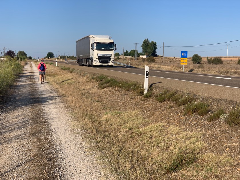 Well, it was, if you discount the older (older than us) fellow pilgrim who we encountered leaving Virgen del Camino and was trying to determine which direction to go of three choices. We didn’t understand his language but our version of Spanish/English seemed to help him out and he walked with us for a bit. He had previously done a pilgrimage to Rome and had climbed Mount Kilimanjaro. He was Russian and lives in Moscow. He was walking to Santiago, taking the bus to Finistere, walking back to Santiago, then working his way back home via train/plane. He was walking faster than we were, so we wished each other well and off he went.