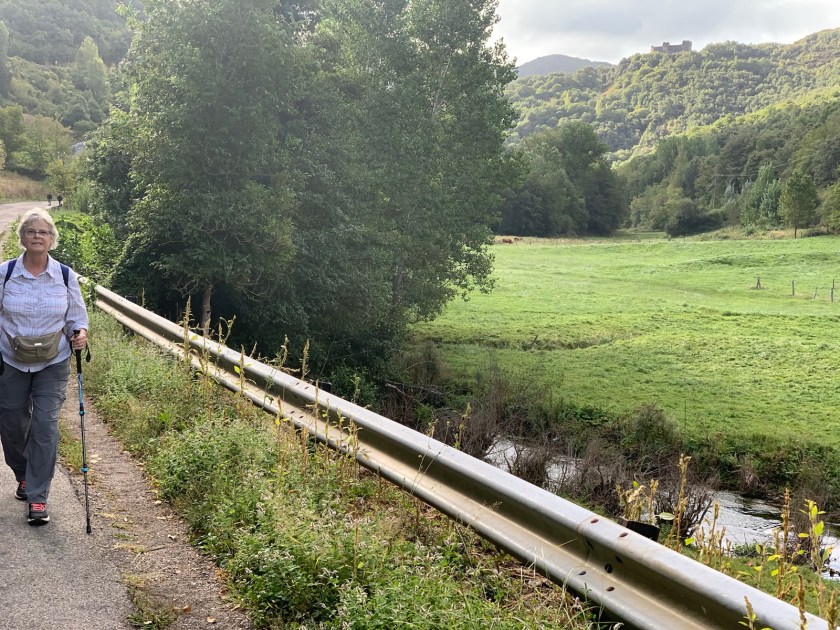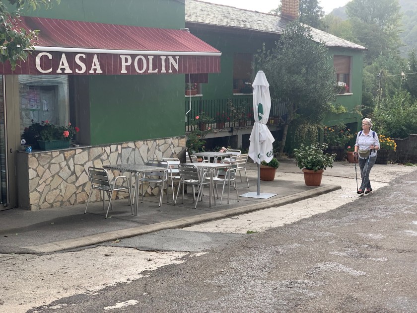 We stopped for breakfast at a huge truck stop and hotel complex, took off our rain gear as blue skies appeared, then walked through Portela de Valcarce (pop. 37).