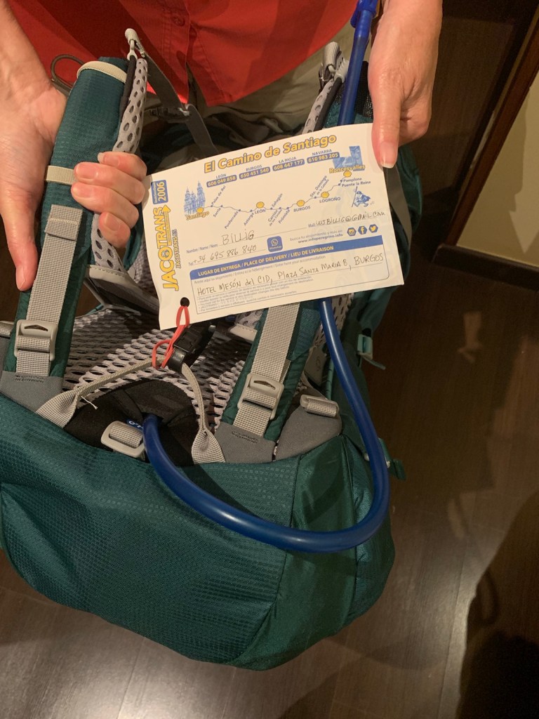 For Camino 2019, we have transported Linda’s backpack almost every day. This has actually made it easier for both of us. Linda has instead carried a daypack weighing 5-6 pounds vs her full pack of 20 lbs. This puts less stress on her knees, letting her walk longer distances more comfortably and avoids getting totally wiped out at the end of a more difficult walk. Jim offloads less critical items from his backpack and stuffs them into Linda’s transported pack, reducing his pack weight by about 5 pounds, making his walk easier. This way, if Linda’s pack doesn’t end up where it should on a given day, Jim still has all our essential items with him to sustain us while tracking down Linda’s pack.