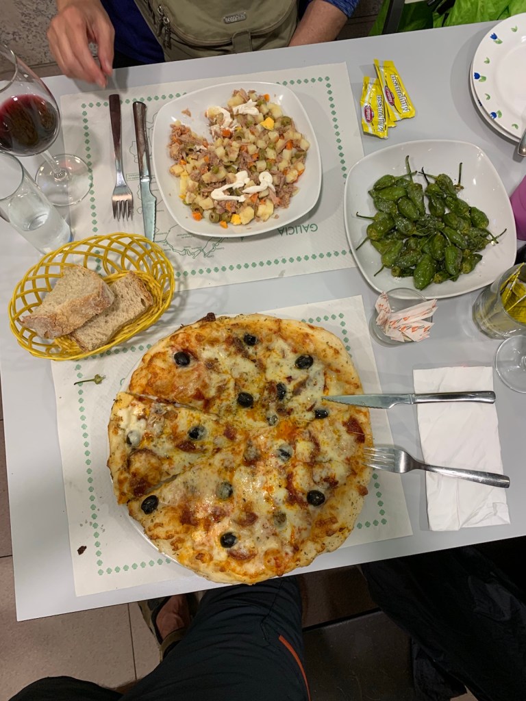 For lunch/dinner we walked to a small hotel/restaurant on a plaza a block from our hotel. It was a delicious combination of pizza, roasted padrón peppers and ensalad Rusa.