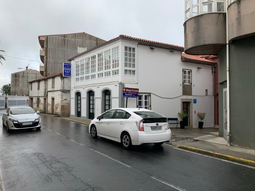 We arrived at Pencion Domus Gallery in Arzúa at 10:15 and were able to check-in shortly thereafter. As soon as we sat down in the pencion lobby, waiting for our room, it began to rain seriously… boy, did we dodge a bullet this morning.