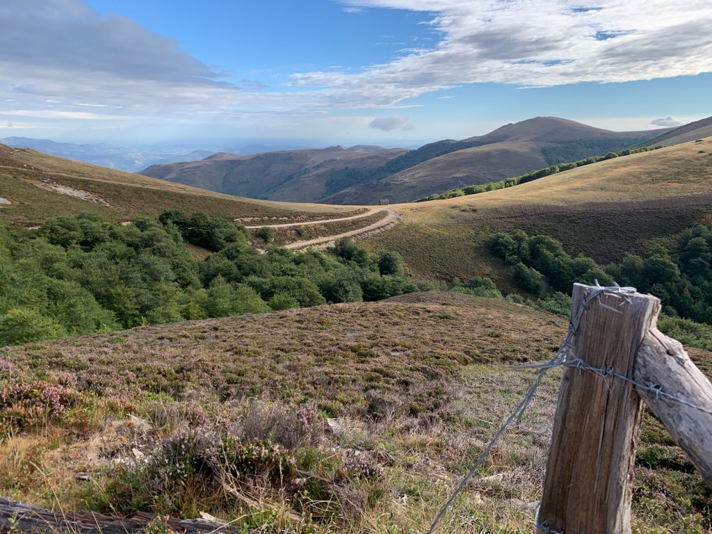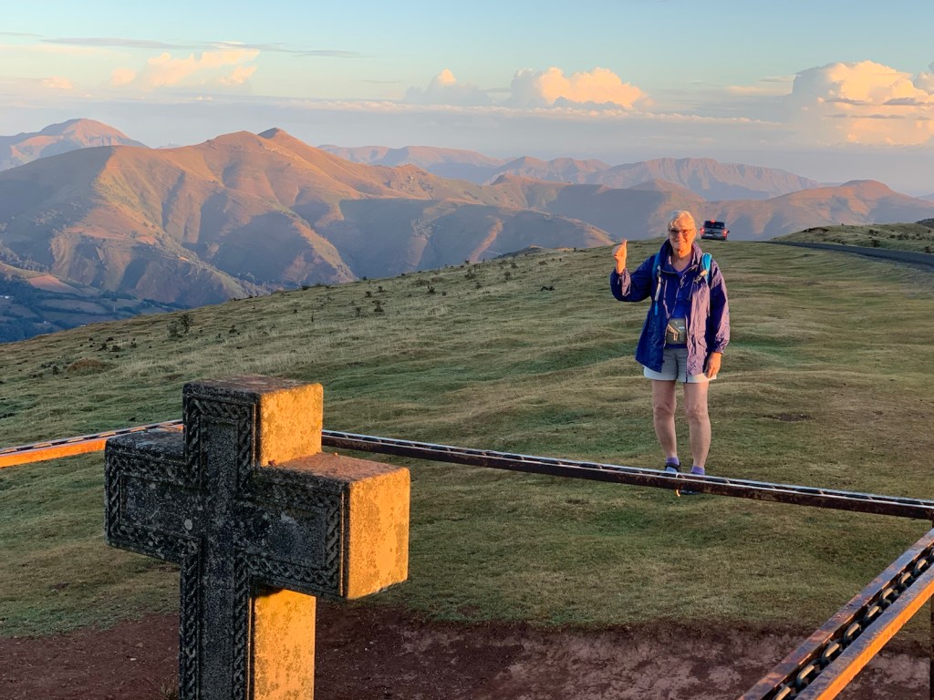 We had planned to have our taxi return this morning to the Virgin de Baikorri, where we finished yesterday. But on our trip up the Pyrenees by taxi, we decided to cut ourselves some slack for today’s walk. Our driver, instead, drove 2.2 miles past the Virgin to the Croix de Thibault, located at the point where the Camino leaves the pavement and heads upward toward Spain. So the Croix (Cross) is where we began today’s walk.