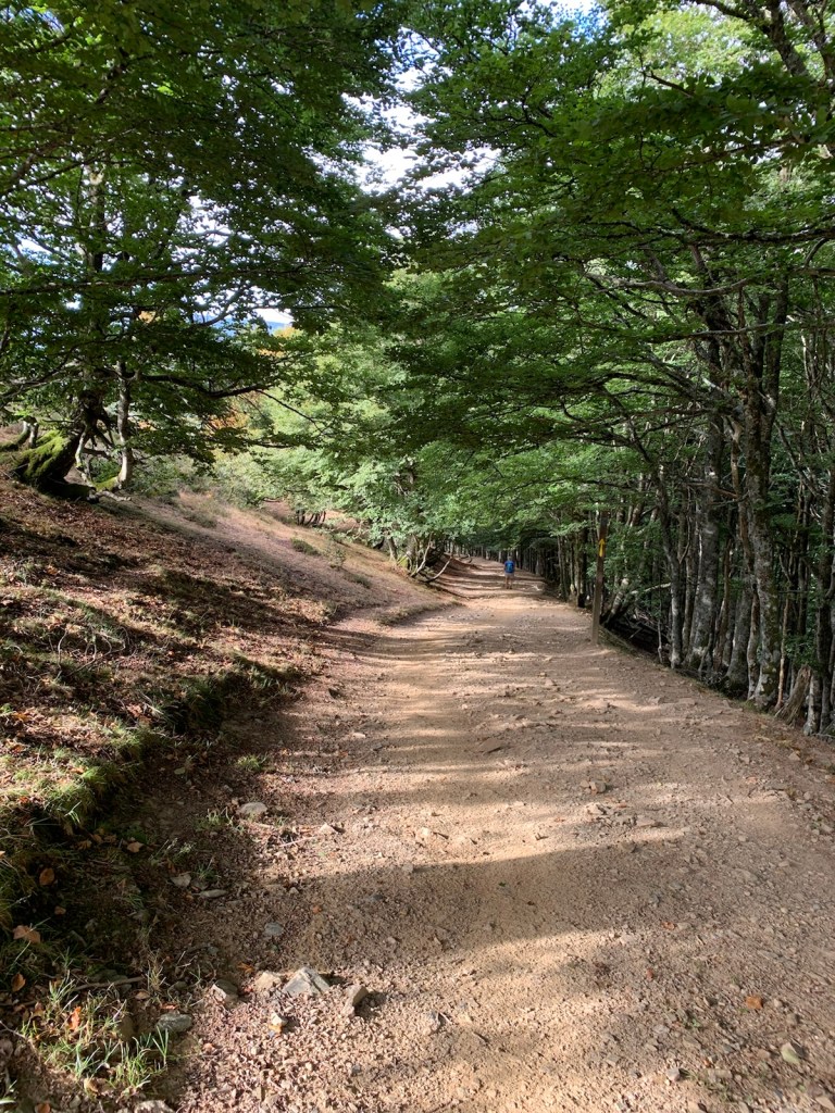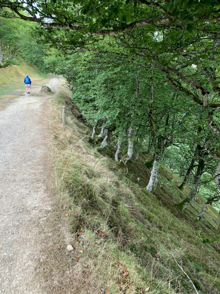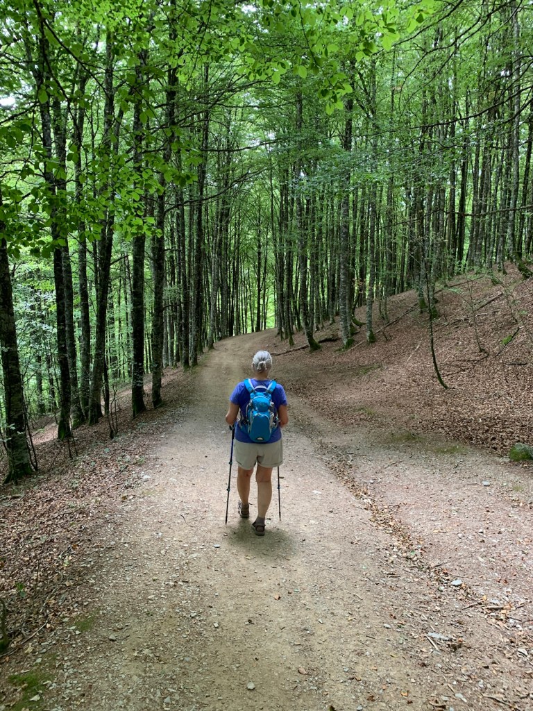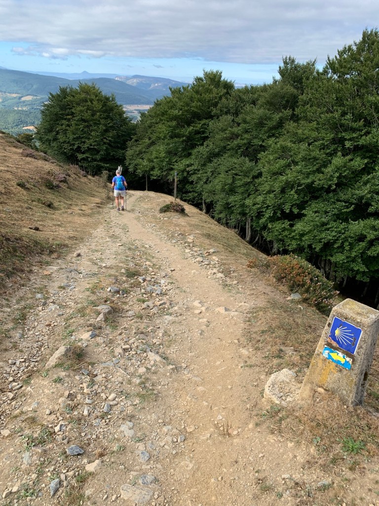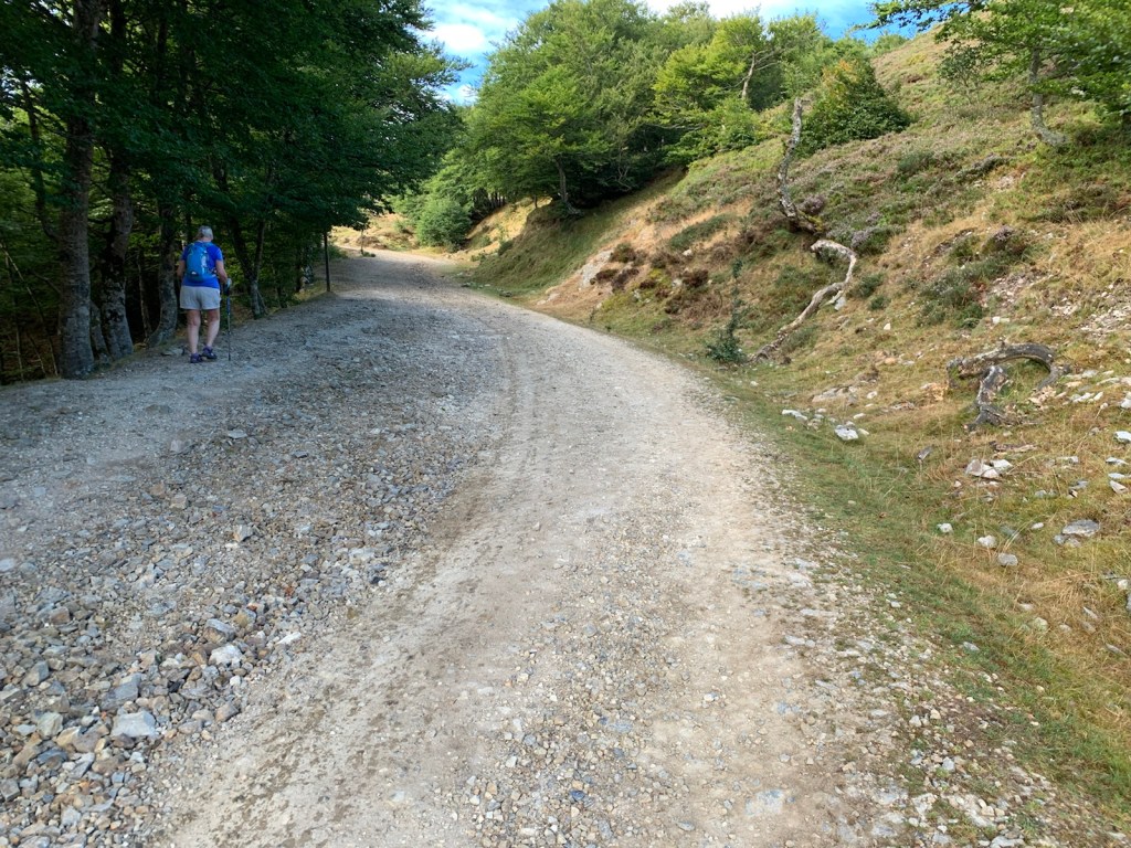 The most difficult 1/2 mile of the Camino, thus far, was the struggle to maintain footing and avoid a major leg injury on the initial descent down the mountain from Lepoder toward Roncevalles. We used our trekking poles to hold us back and maintain balance over the root and rock covered wash-of-a “path”. But even with this extra precaution, each step risked becoming a potential Camino ending disaster. When we finally reached a more manageable walking surface our legs had become like jelly, near collapse.. and we struggled the final few miles into Roncesvalles. Our photos, don’t adequately portray what we experienced. Our photos are also limited because we were too involved trying to survive, to let go our our poles to free our hands to hold a phone to take a photo!!