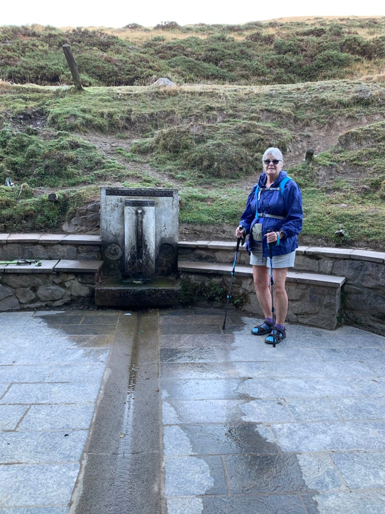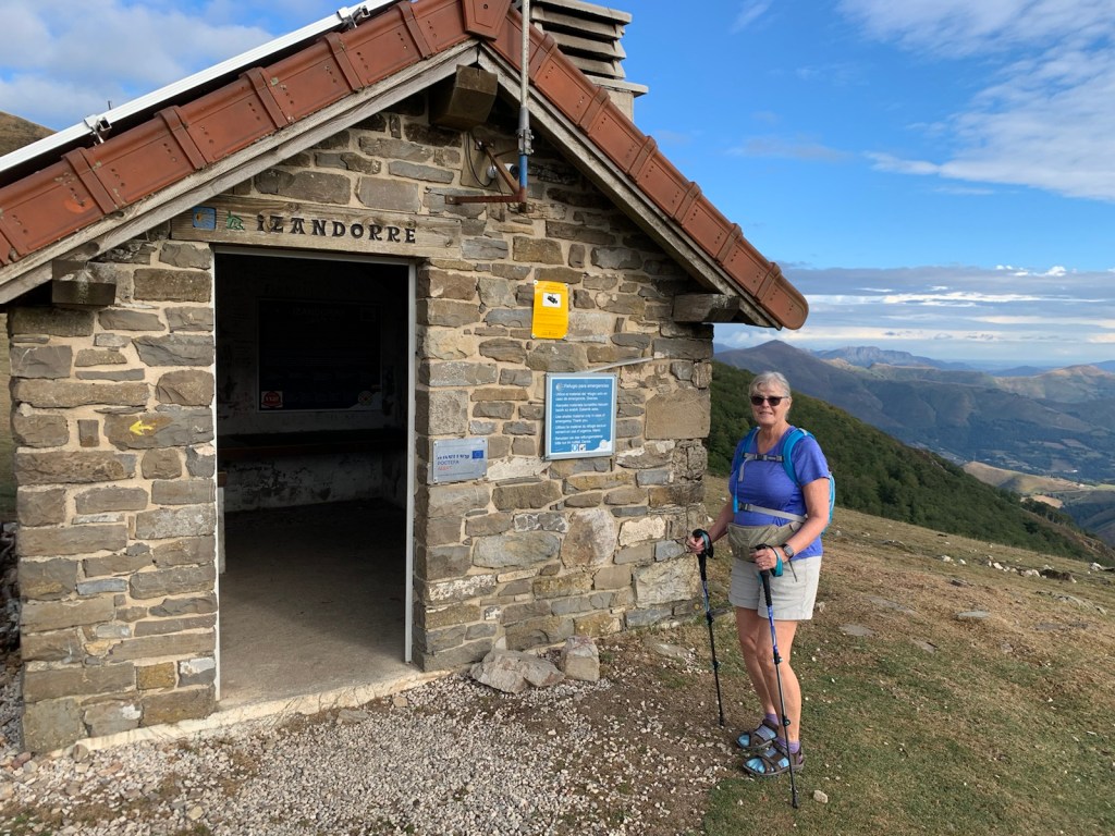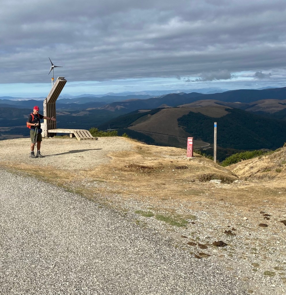 Several miles later we passed the emergency shelter that we and a dozen other pilgrims used in 2012 to get a half hour of relief from gale force winds with horizontal driving rain. dense fog and 50F shivering temperatures. We always stop here for a few minutes, to take a break before the final steep climb to appreciate the beautiful clear, blue sky, refreshing breeze and be thankful for this special, strategically placed refuge.