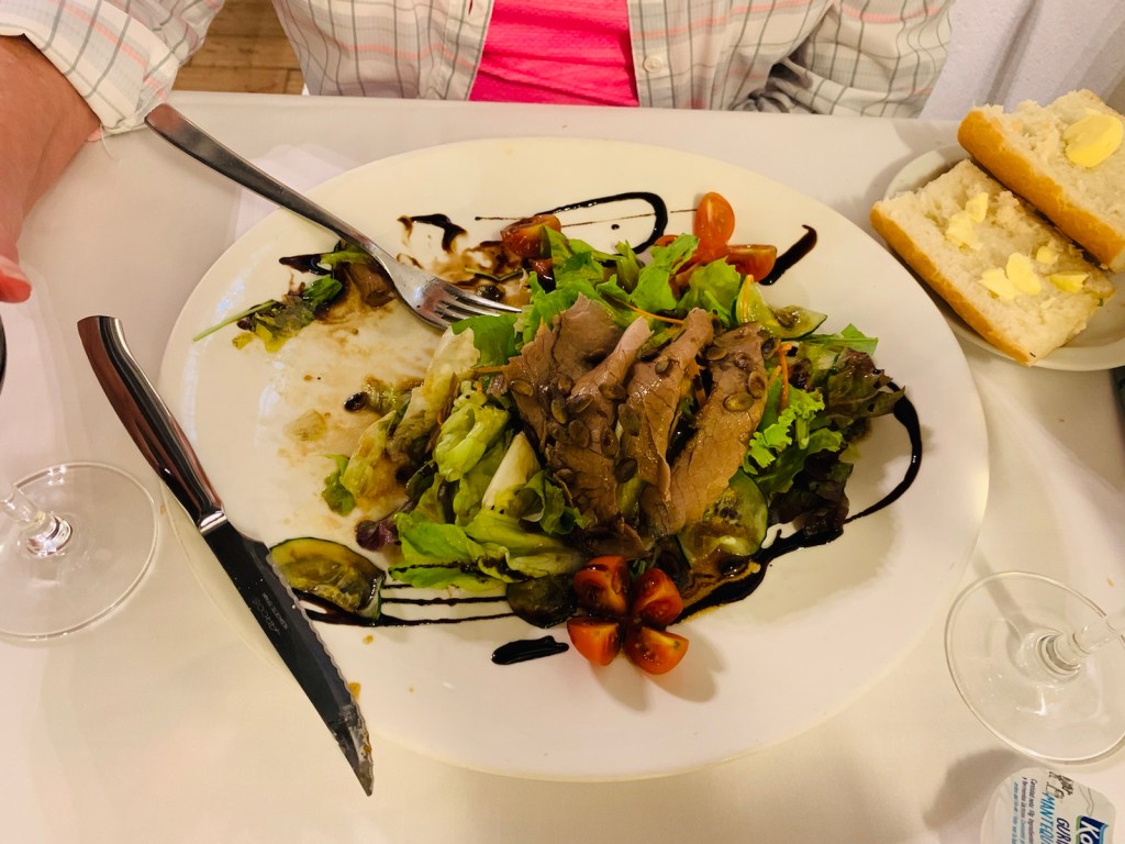 Tonight we had dinner once again in the Hotel Dining Room featuring a scrumptious ensalada for Linda and baked sea bass for Jim,