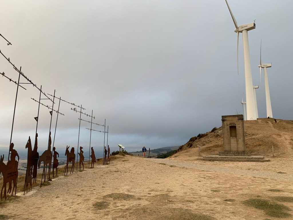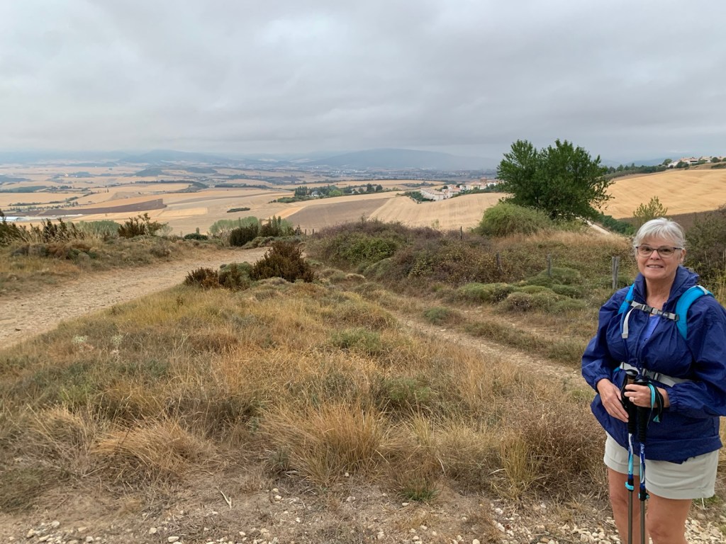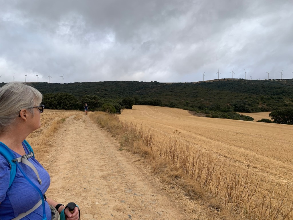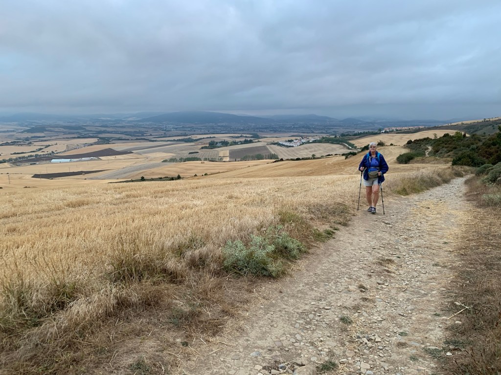 We took a taxi to Zaraguiqui, where we finished our walk from Pamplona on August 14. Our walk began at first light (7:01) and the clouds were covering the top of the Alto de Perdon. As we climbed up the steep grade, we snapped photos looking back at Pamplona… it seemed like the higher we climbed the more the clouds lifted, giving us clear views of where we had been.