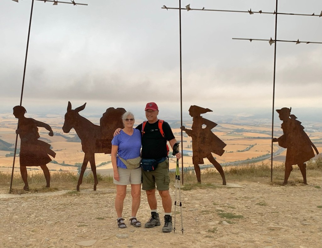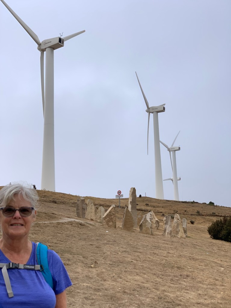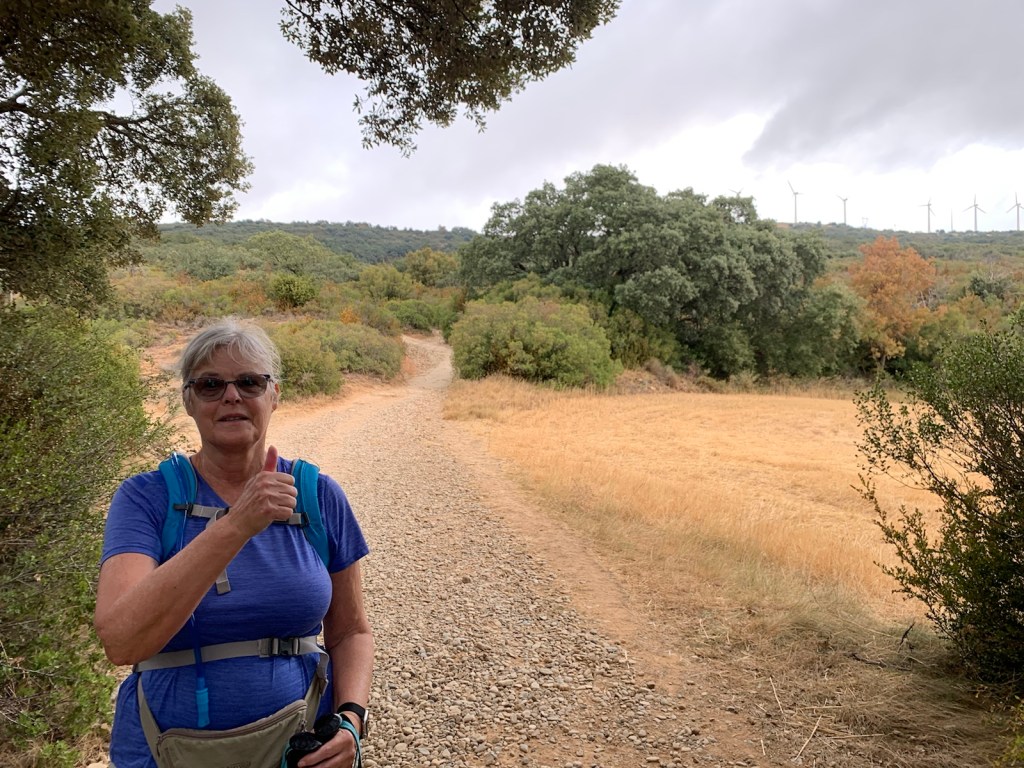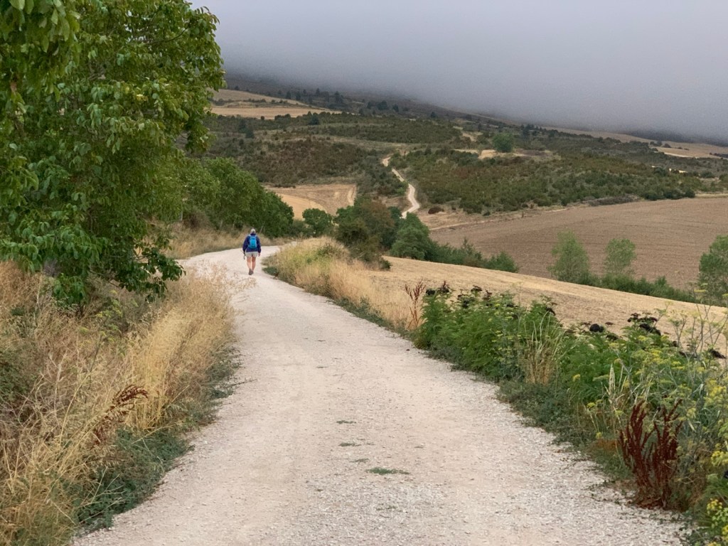 We took a taxi to Zaraguiqui, where we finished our walk from Pamplona on August 14. Our walk began at first light (7:01) and the clouds were covering the top of the Alto de Perdon. As we climbed up the steep grade, we snapped photos looking back at Pamplona… it seemed like the higher we climbed the more the clouds lifted, giving us clear views of where we had been.