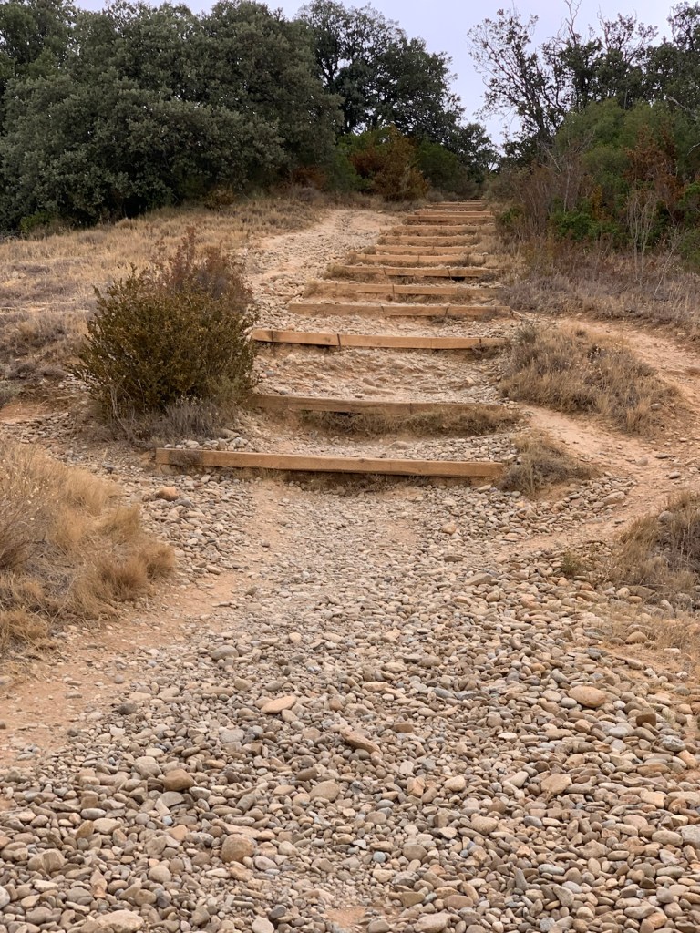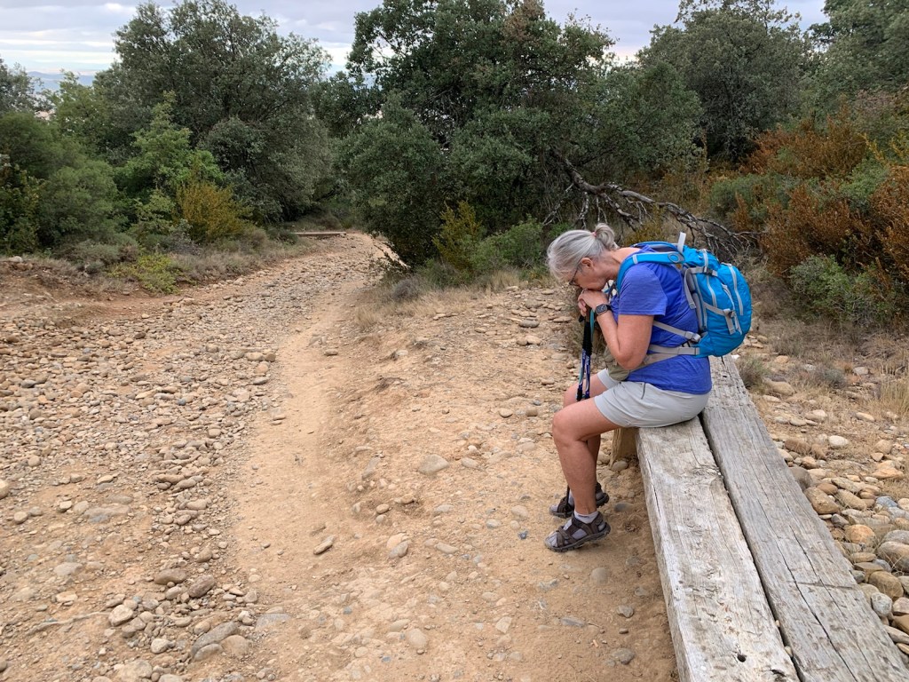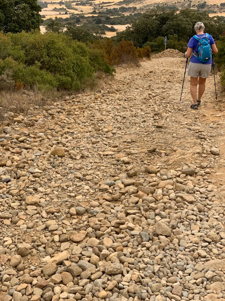 We reached the top, took photos, (with the help of a lone bicycling pilgrim), recharged our bodies with a pain au chocolat, then began the difficult journey down the other side of the mountain.