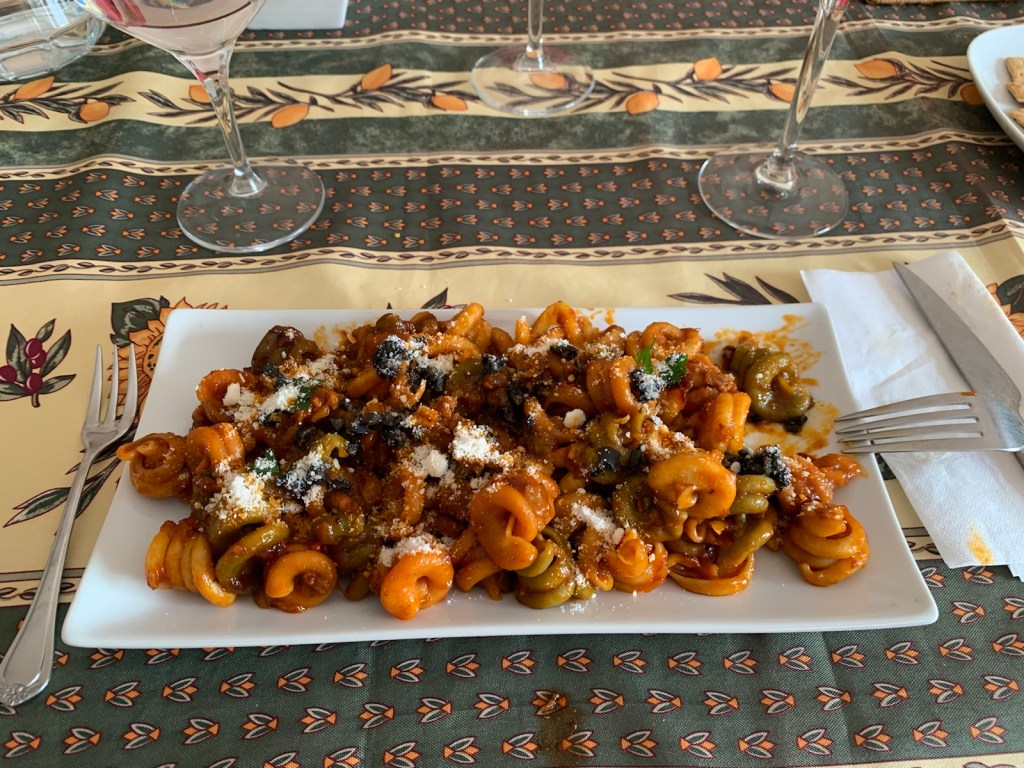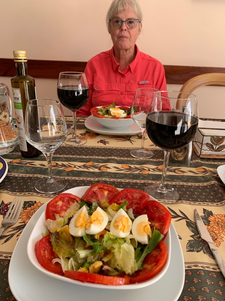She prepared and served us a delicious dinner at 6:30 (not waiting until the standard 7:00)… of mixed vegetable salad, a scrumptious pasta dish and simple pineapple/peach dessert. Wine and water were also included. (14€ each).