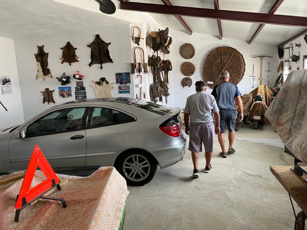 We continued into another room which was a garage occupied by a Mercedes Kompressor. The garage walls were neatly filled with displays of farm implements, skis, children’s antique toys, horse tack, etc. Jim asked Mario which saddle he rode in his first Camino and he proudly pointed to it.