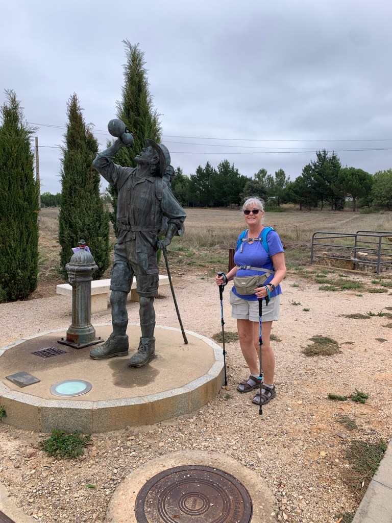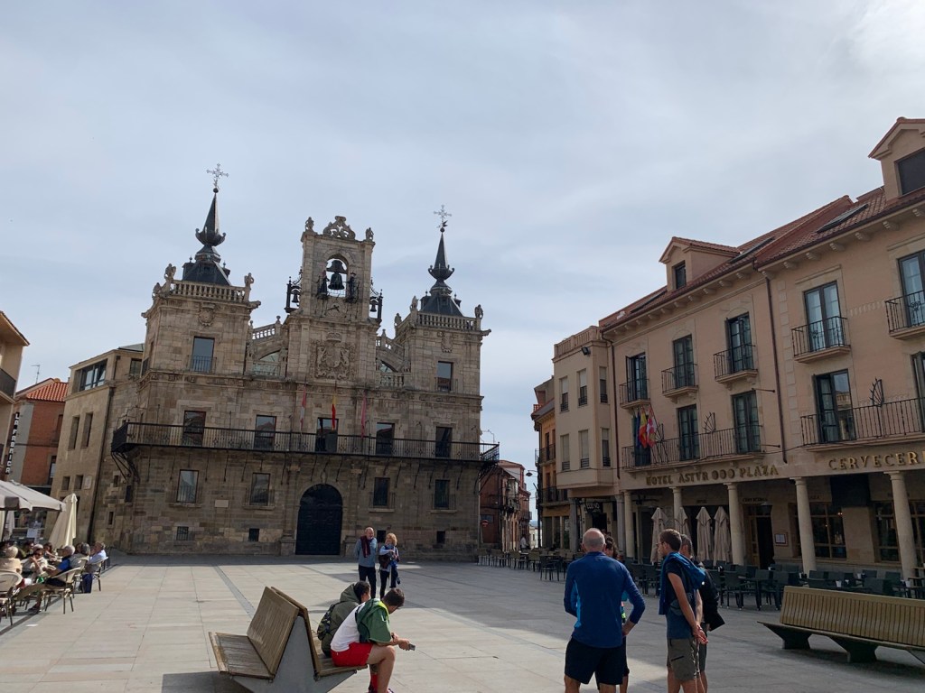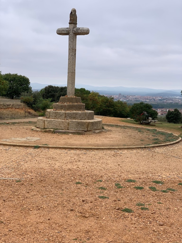 A monument to San Justa de Vega on the hill outside of the village of the same name. Astorga can be seen in the distance, another 3 miles away.Linda and a thirsty and very still pilgrim at the entrance of the villagethe sidewalk into St Justa de Vega was lined with lavender.Main street, maybe the only street through St Justa. We’ve stayed here on two previous Caminos, instead of Astorga.back on a wide path between San Justa and Astorgathe zig-zag bridge over the railroad tracks into Astorga.our hotel, Astur Plaza, and room balcony, overlooking the plaza.Astur Plaza