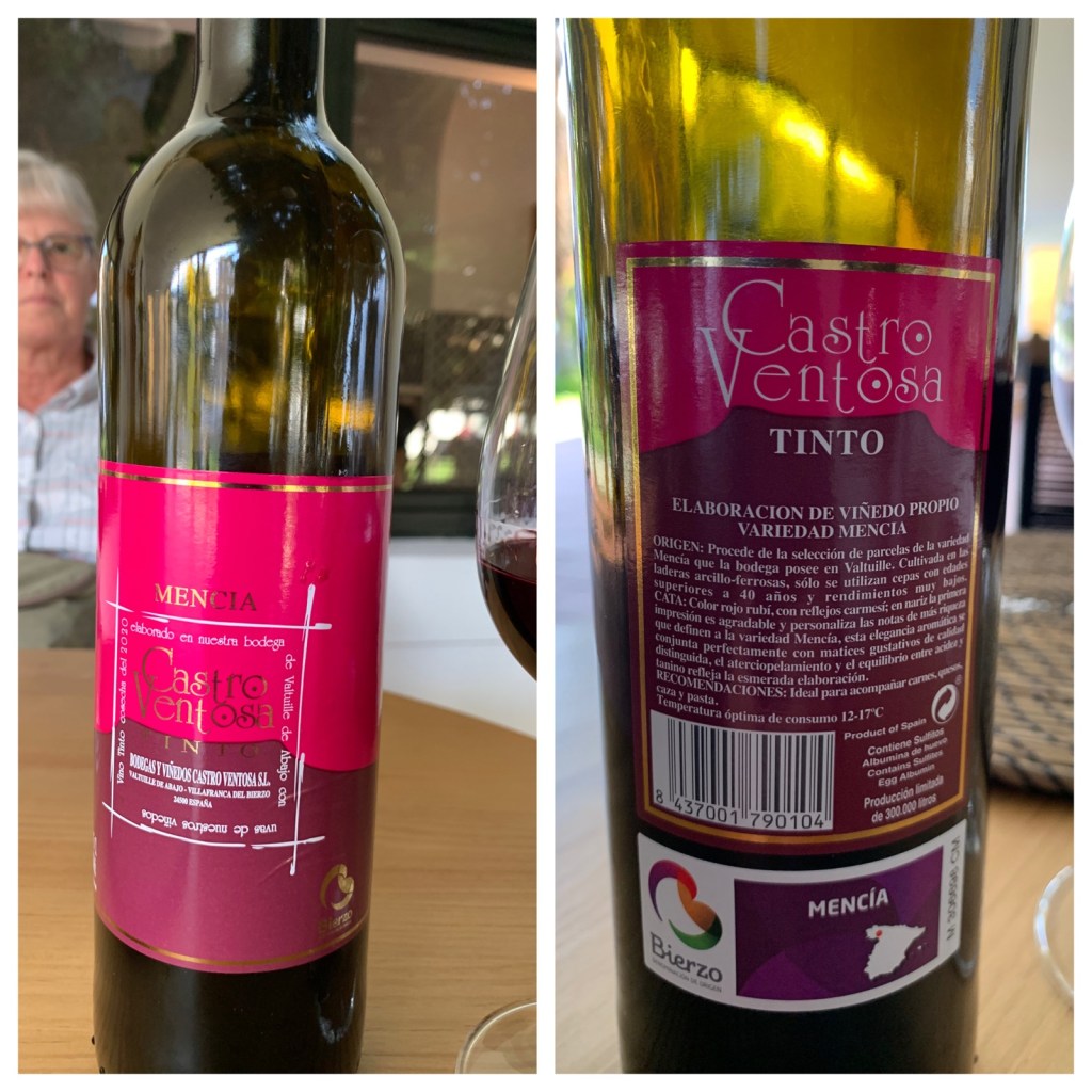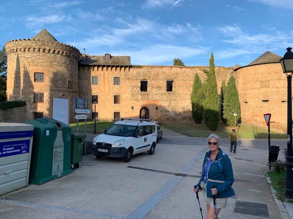 We had a pilgrim dinner in the town square for lunch. We talked with Elaina, from Fayetteville, Georgia, seated at an adjacent table. On the way back to our room, we picked up some snacks and a bottle of mencía wine.