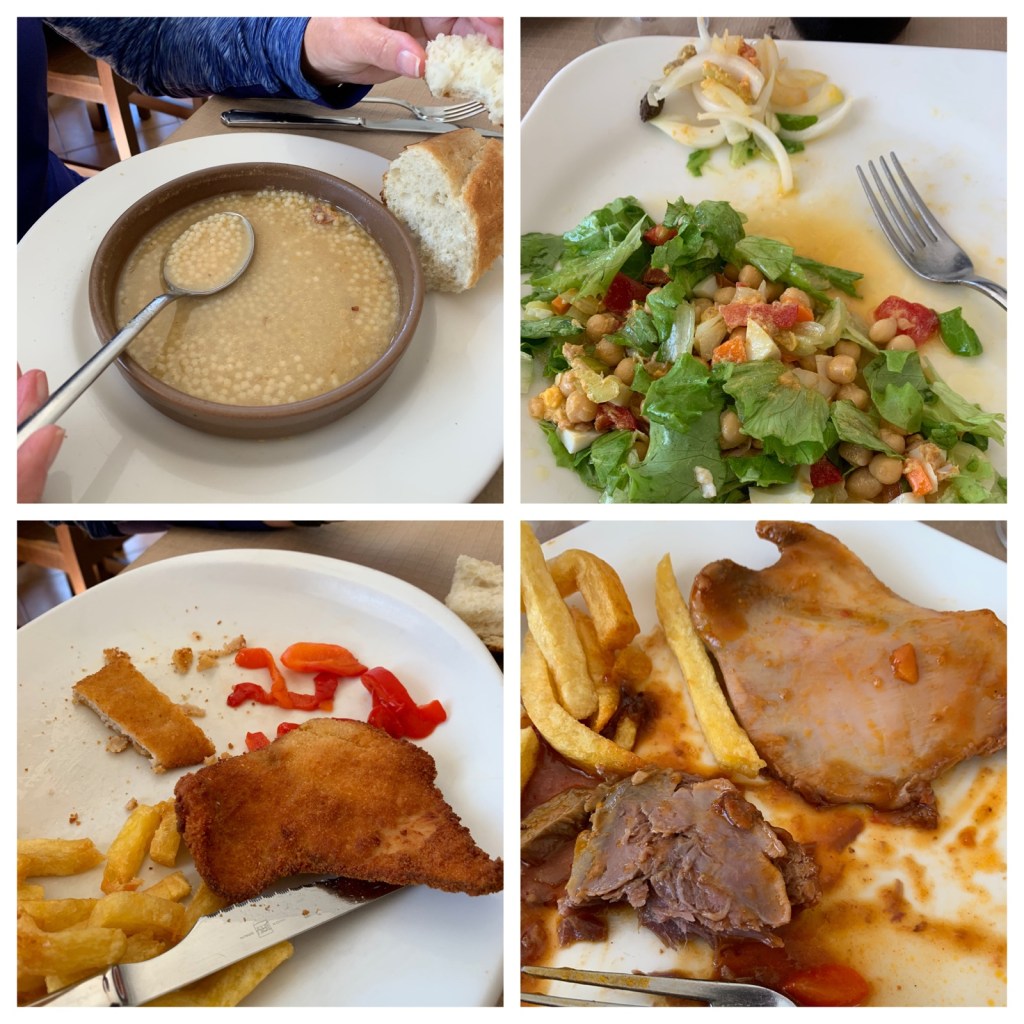 We forgot both 1st and 2nd course photos until nearly consumed (must have been hungry). Chicken broth-pasta soup for Linda and Garbonzo ensalada mixta for Jim. Breaded chicken breast for Linda and stewed pig’s knuckle for Jim.… and another nice Bierzo vino tinto .
