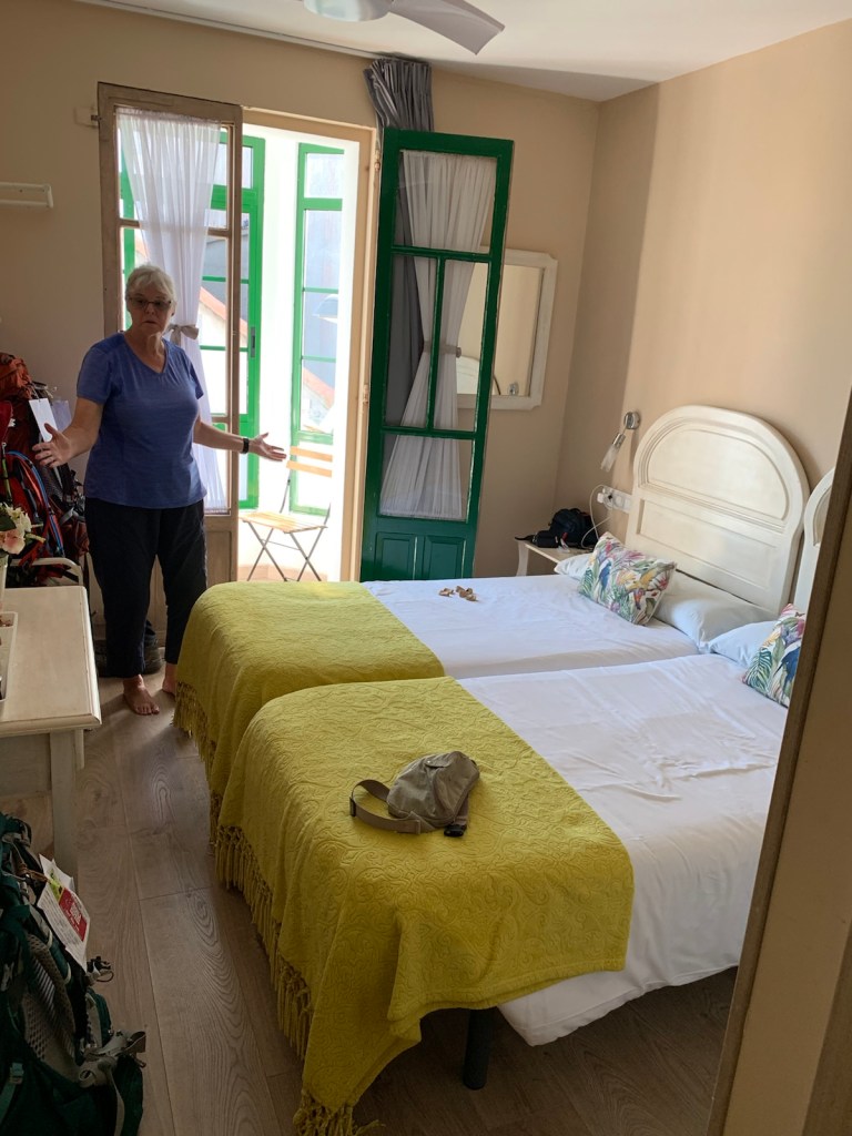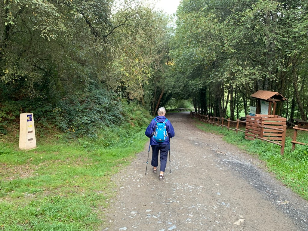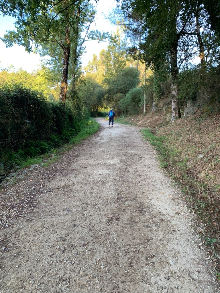 Kiwi fruit overheaddownhill out of Castañeda a long, not-so-steep, grade for a half-miledownhilltwo big dawgs… looked like St Bernards… ignored us … it’s a good thing cause that wire wouldn’t hold’em for sure.… one final stop at Bar Manuel, surrounded by farmland, on the hill going into Ribadiso da Baixo. The owners live above the bar.Following a pilgrim that looks a lot like a backhoe over the bridge into Ribadiso da Baixo.Ribadiso has origins in the 6th century and housed a pilgrim hospital in the 16th century. The hospital was converted to an albergue in 1993 and the rest of the village has grown with new buildings and albergues added each time we pass through.the shaded path on final leg into Arzúa.A monster of a wall painting going into Arzúa highlighting the Camino Holy Year of 2021 (extending thru 2022 because of pandemic)our room at Pension Luis in Arzúa, with sunroom!some places we’ve stayed didn’t have soap, toilet paper or drinking cups… this one has very nice amenities.