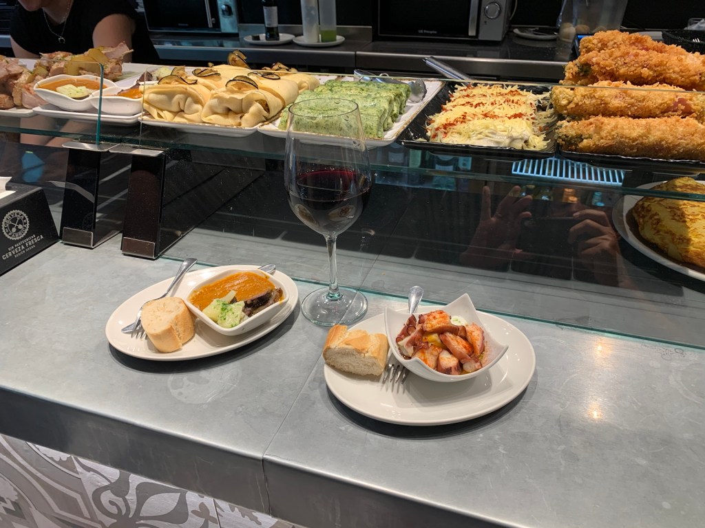 Jim’s first selection was (left) was Carilleras: pork cheeks, potato slices in a well seasoned red brown sauce. The second selection (right) was Pulpo a la Gallega: octopus and potato slices seasoned with sea salt, Spanish paprika and extra virgin olive oil. And a nice glass of vino tinto Navarro red wine. It was a very successful sampling… everything was delicious.