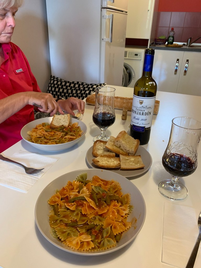 For dinner Linda had a yogurt from the fridge and Jim made a sandwich on a leftover baguette from lunch with sliced turkey and havarti. We made bocadillos of scrambled egg and cheese and stored them in the fridge tonight to take with us tomorrow morning for breakfast.
