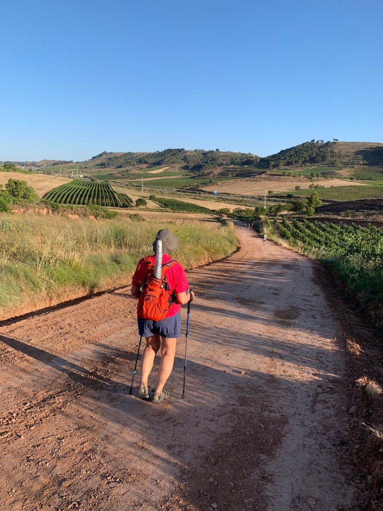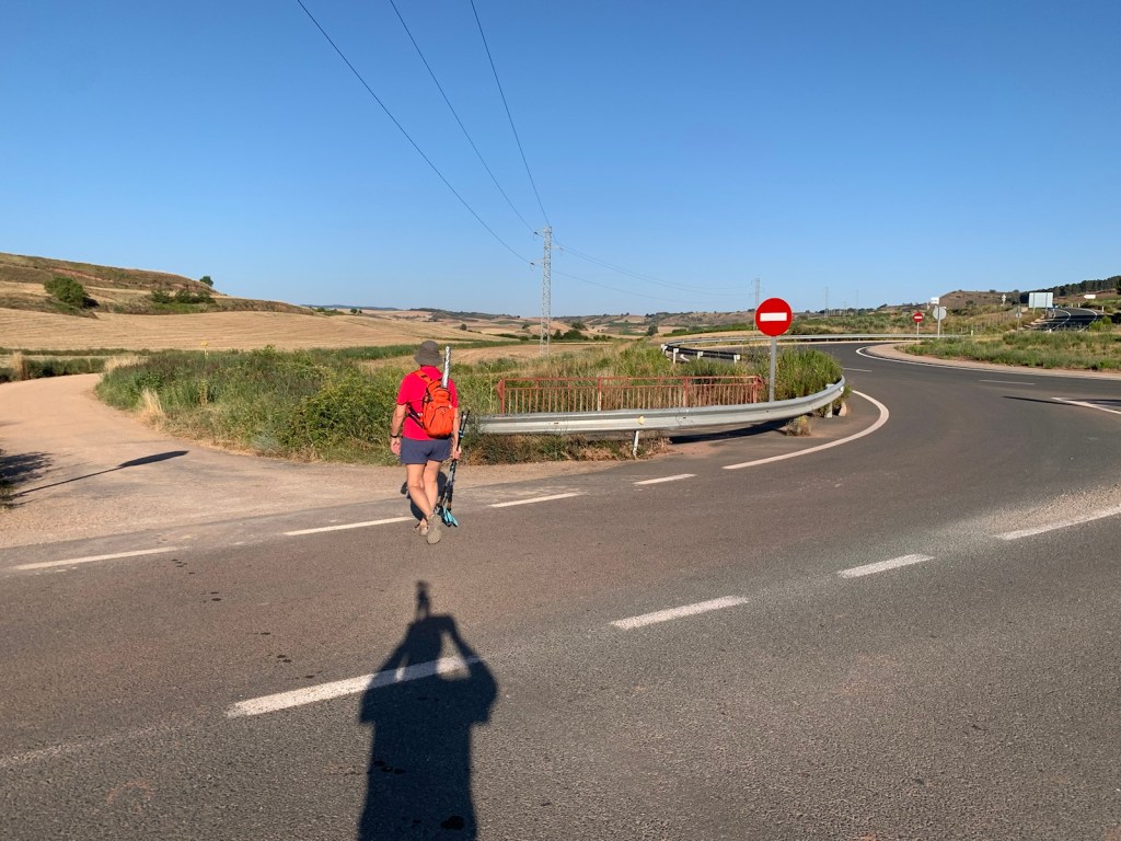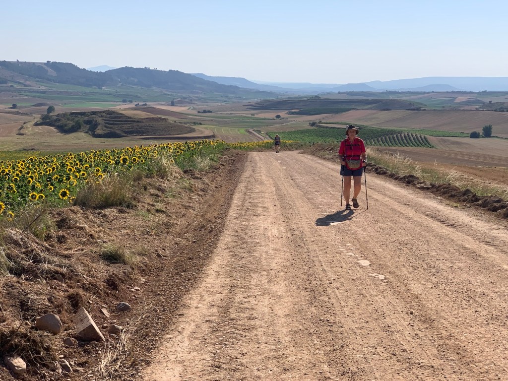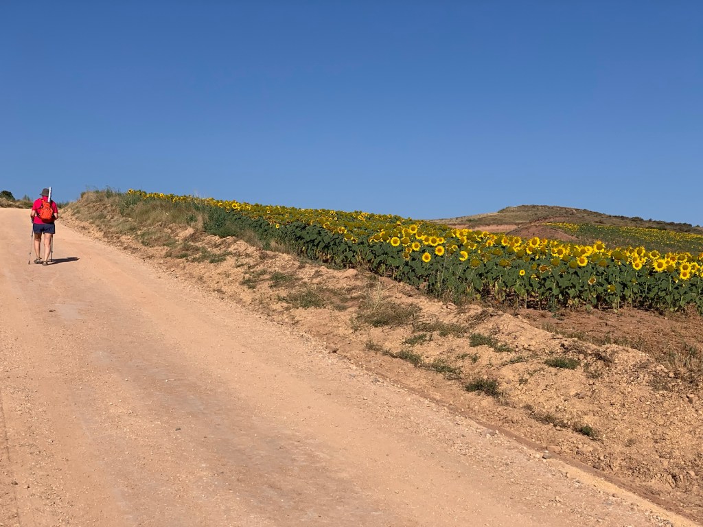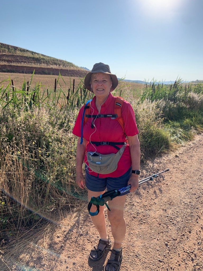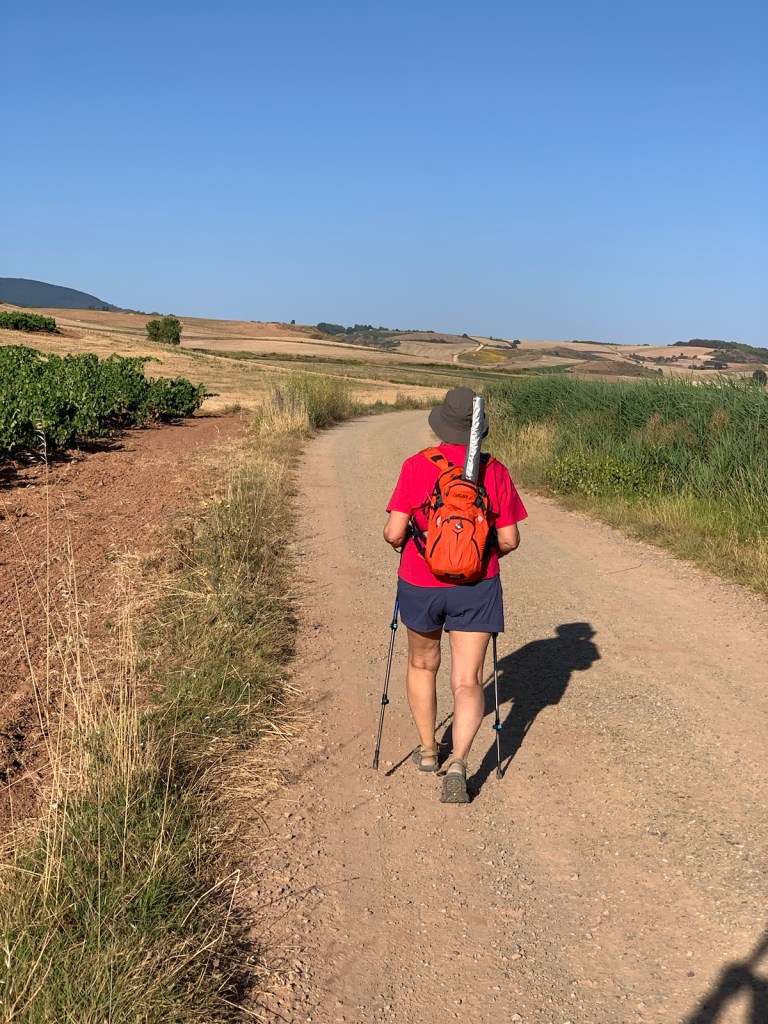no longer dancing but still singing her way up the final steep 2 miles to the Rioja Alta GOLF COURSE!!! ( Probably not noticing the first sunflower fields of Camino2023)