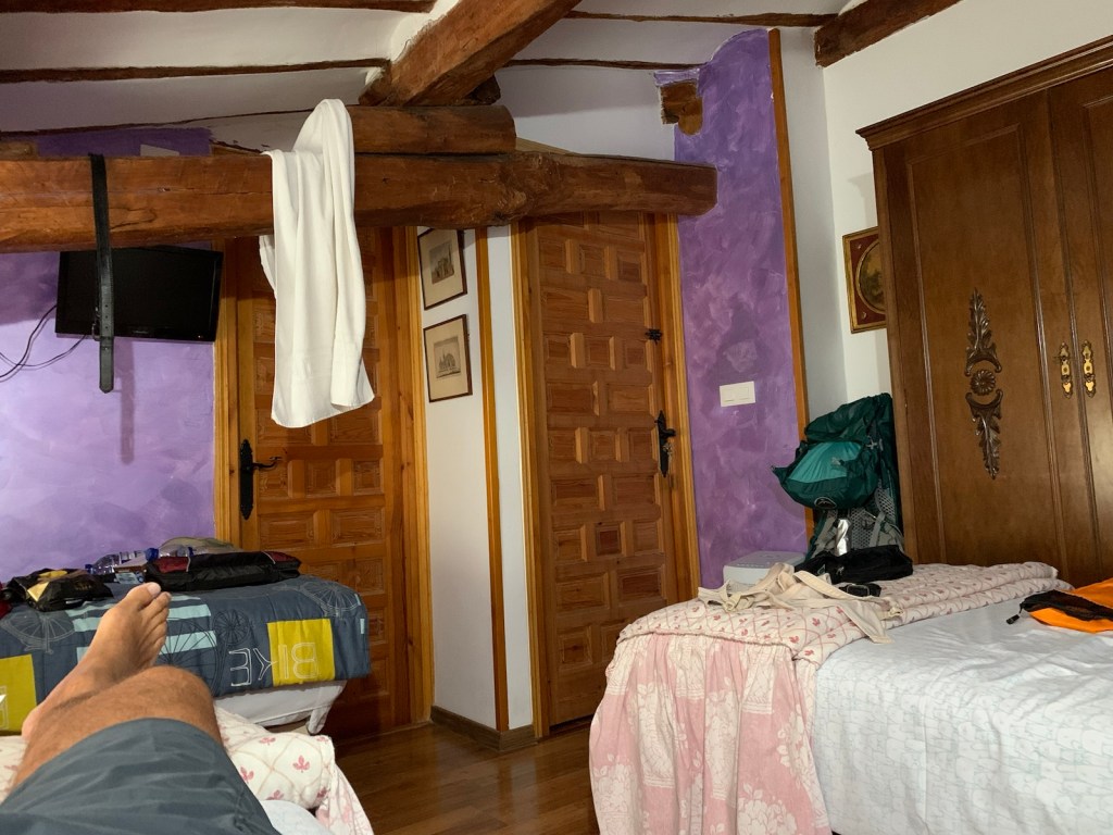 our room in Casa Victoria at Cirueña.. Jim hung a towel over the beam to warn him not to hit his head on the very low beam.