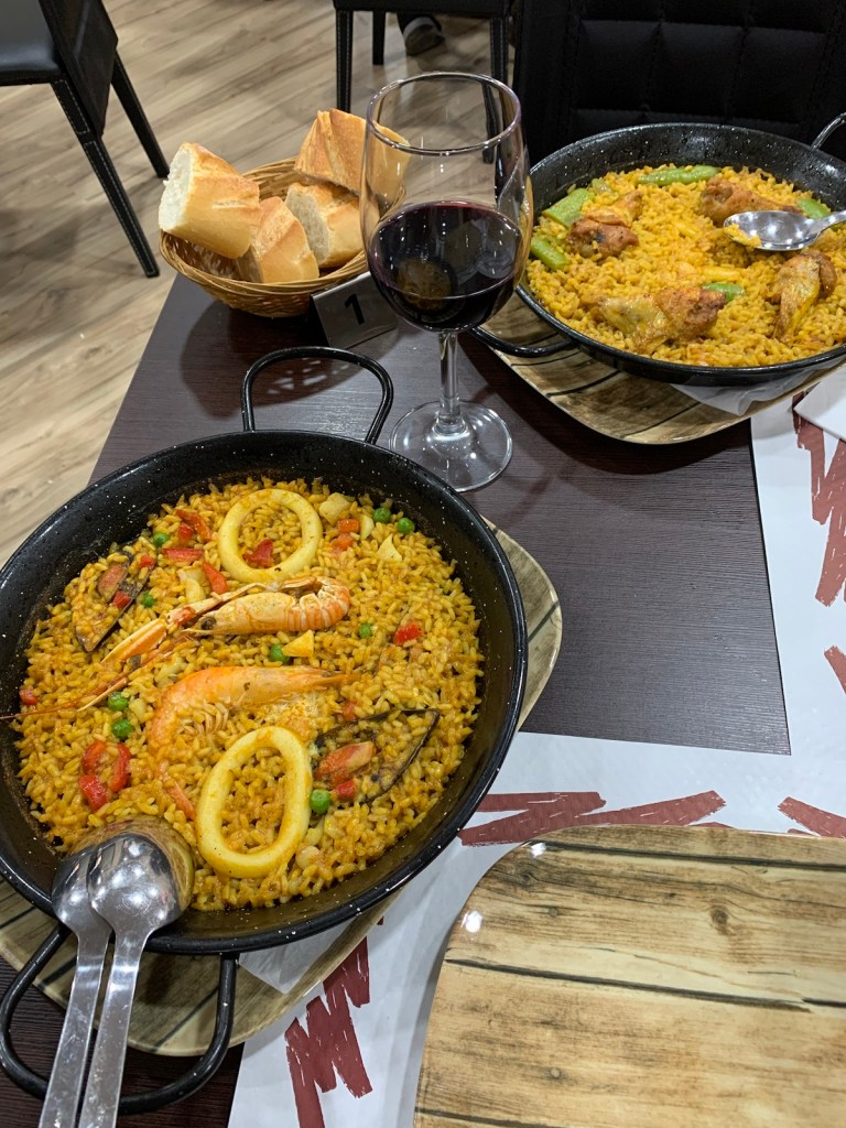 supper: chicken paella for Linda and seafood paella for Jim with local Rioja wine.