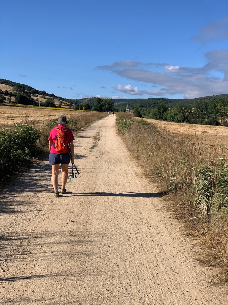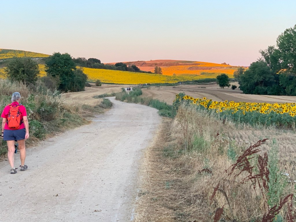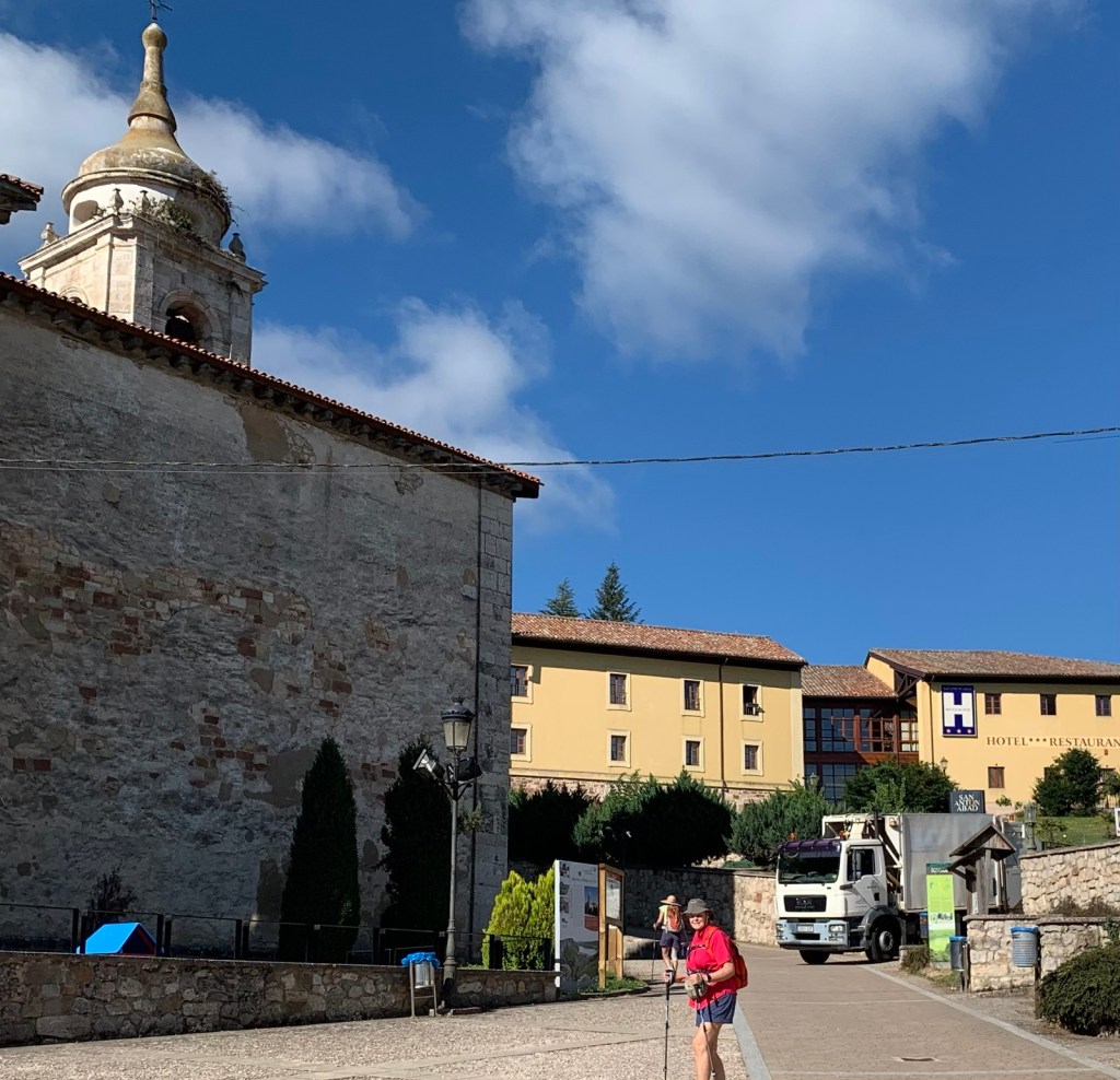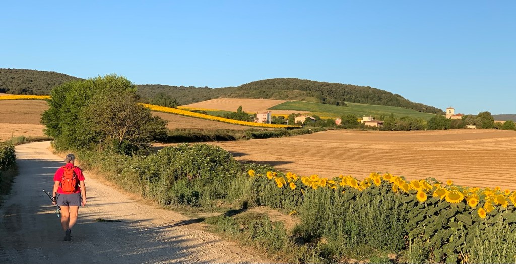 leaving Belorado at 630.more wall art on a building on the highway just outside BeloradoThis is typical of our walk today: mostly flat, dirt path, winding through grain fields and lots if blooming sunflowers welcoming the rising sun.approaching the village of Villambistia where we stopped for breakfast, 4 miles from Belorado at Casa de los Deseos.The tiny church in Villambistia has never been open on previous Caminos, so we stopped to take a look.interior of church with no name in Villambistia.According to a local tradition, immersing your head in this fountain, will cure you of tiredness. As on 4 previous walk- bys, we decided not to… especially when noting the sign on the fountain saying the water was not drinkable!back on the path after passing through Espinosa del Camino (pop. 36)We observed this field of grain that had been partially cut. The tops of the plants were gone and the stalks were left piled in a row where the full plant had apparently been cut.we guessed that some kind of harvesting machine had removed and collected the oat-like tops and left the stalks to be baled later. There was no one around to ask, and not having such knowledge ourselves, we pondered on briefly..,.….. and then we observed a machine that looked like it could have done what we guessed had happened. Ah, the mysteries of the Camino!These sunflowers were all looking at us as we passedThese sunflowers, on the opposite side of the path, appeared to have turned their backs on us, but it was nothing personal. We just happened to be in the opposite direction of the bright sunshine. Guess that’s why they call them… sunflowers!the last half mile of the path leading into Villafranca Montes de Oca (the small village is hidden behind the clump of trees just to the right of the path.)walking along the busy intersection of a national highway that passes through Villfranca…. (pop. 164).Our hotel in background, 18th century Iglesia de Santiago on the left.the entrance to San Anton Abad, formerly the Hospital de la Reina that hosted up to 18,000 pilgrims per year during the 17th century.