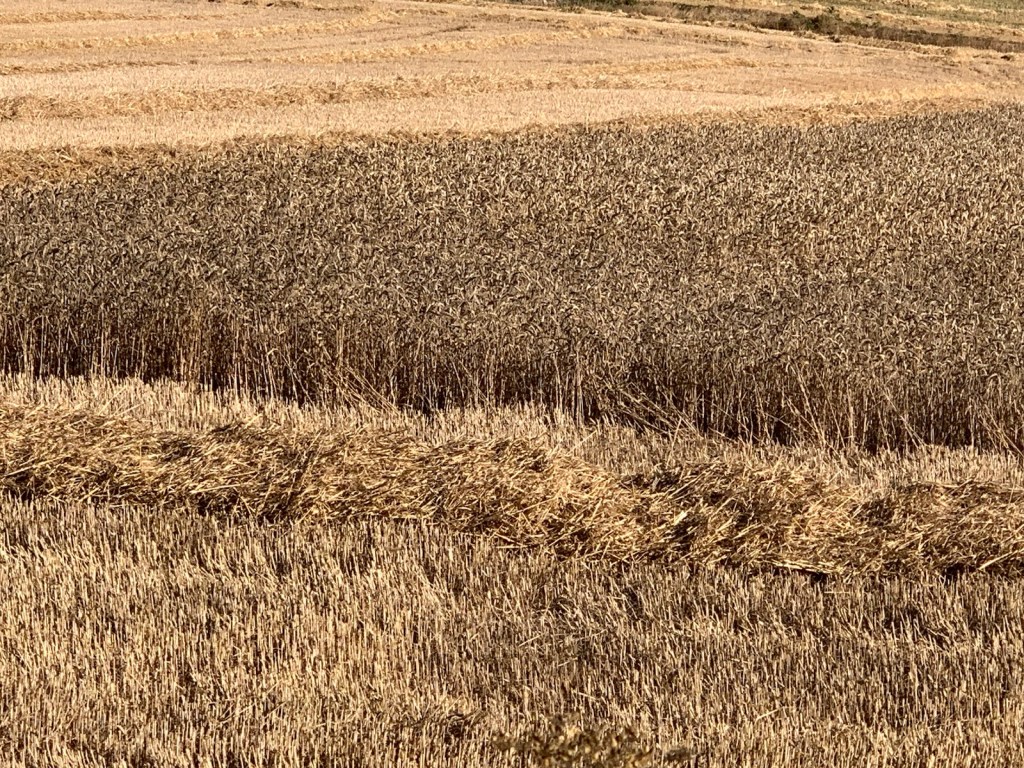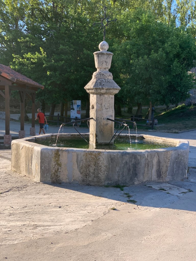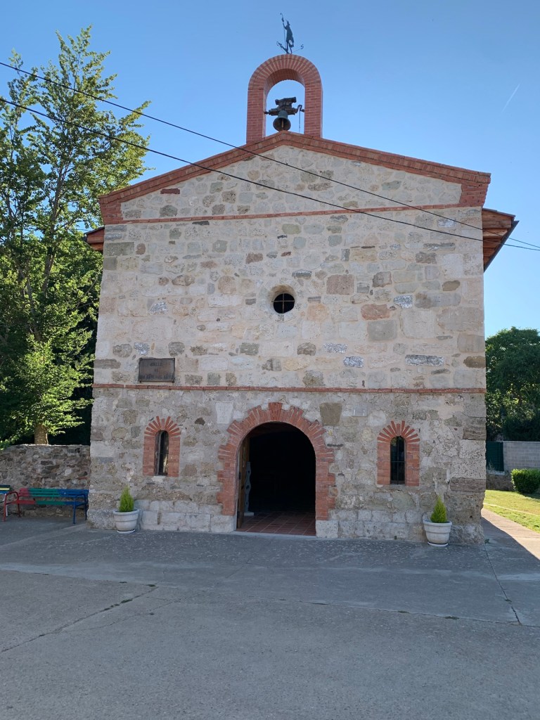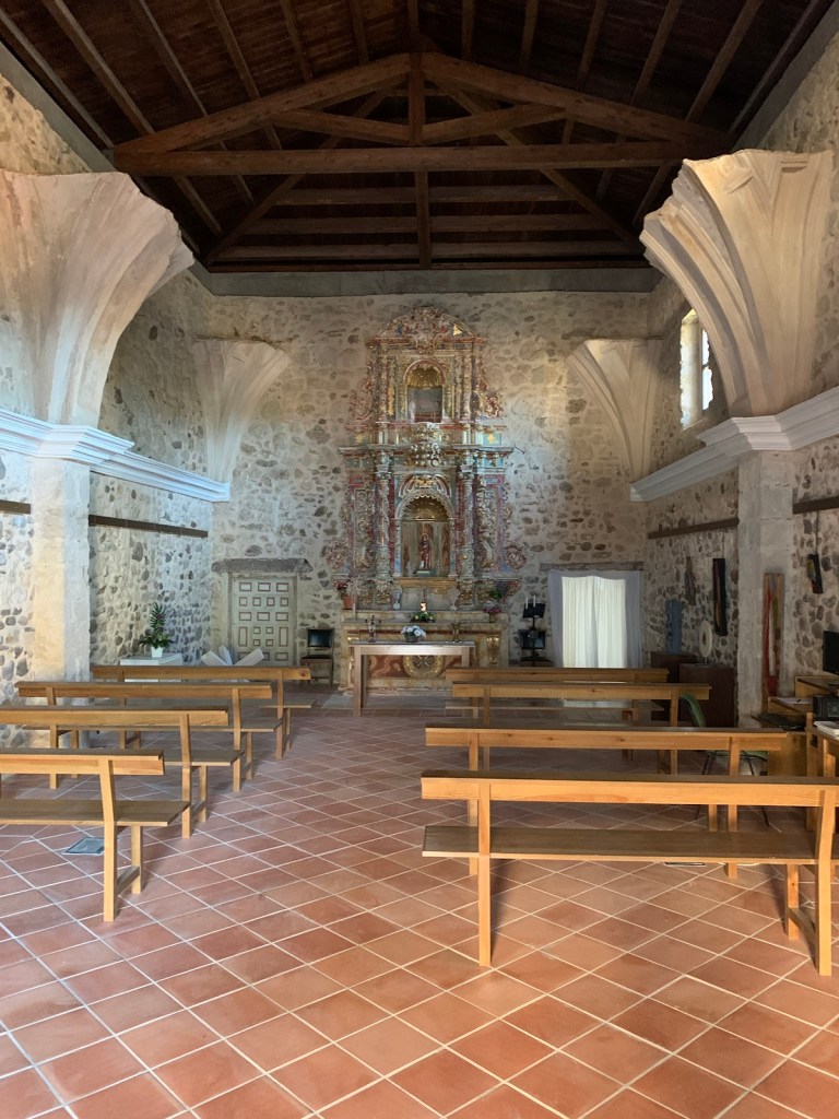 leaving Belorado at 630.more wall art on a building on the highway just outside BeloradoThis is typical of our walk today: mostly flat, dirt path, winding through grain fields and lots if blooming sunflowers welcoming the rising sun.approaching the village of Villambistia where we stopped for breakfast, 4 miles from Belorado at Casa de los Deseos.The tiny church in Villambistia has never been open on previous Caminos, so we stopped to take a look.interior of church with no name in Villambistia.According to a local tradition, immersing your head in this fountain, will cure you of tiredness. As on 4 previous walk- bys, we decided not to… especially when noting the sign on the fountain saying the water was not drinkable!back on the path after passing through Espinosa del Camino (pop. 36)We observed this field of grain that had been partially cut. The tops of the plants were gone and the stalks were left piled in a row where the full plant had apparently been cut.we guessed that some kind of harvesting machine had removed and collected the oat-like tops and left the stalks to be baled later. There was no one around to ask, and not having such knowledge ourselves, we pondered on briefly..,.….. and then we observed a machine that looked like it could have done what we guessed had happened. Ah, the mysteries of the Camino!These sunflowers were all looking at us as we passedThese sunflowers, on the opposite side of the path, appeared to have turned their backs on us, but it was nothing personal. We just happened to be in the opposite direction of the bright sunshine. Guess that’s why they call them… sunflowers!the last half mile of the path leading into Villafranca Montes de Oca (the small village is hidden behind the clump of trees just to the right of the path.)walking along the busy intersection of a national highway that passes through Villfranca…. (pop. 164).Our hotel in background, 18th century Iglesia de Santiago on the left.the entrance to San Anton Abad, formerly the Hospital de la Reina that hosted up to 18,000 pilgrims per year during the 17th century.