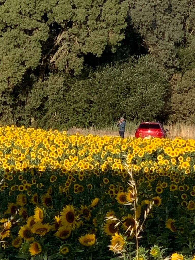 Finally, the music got stronger and appeared to be coming from the sunflower field ahead of us. We kept walking and spotted a man, still quite a distance from us, standing next to his car, playing a vertically held instrument and facing a large cross.