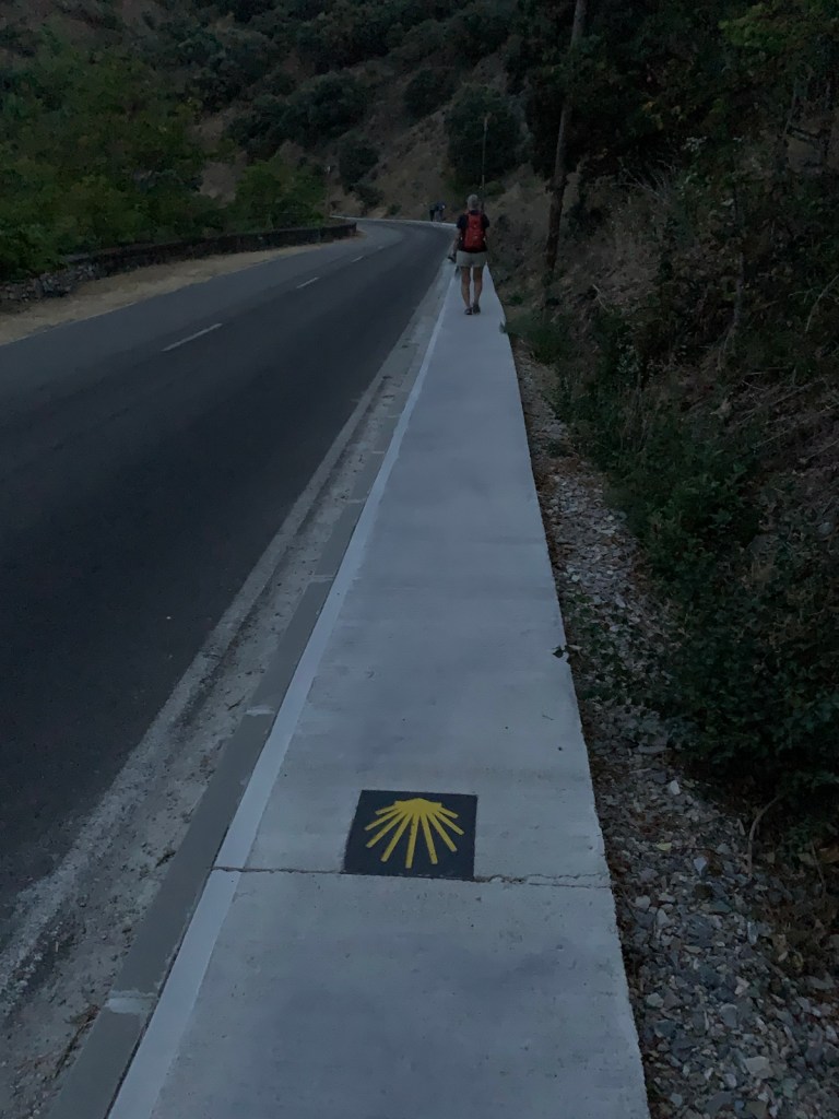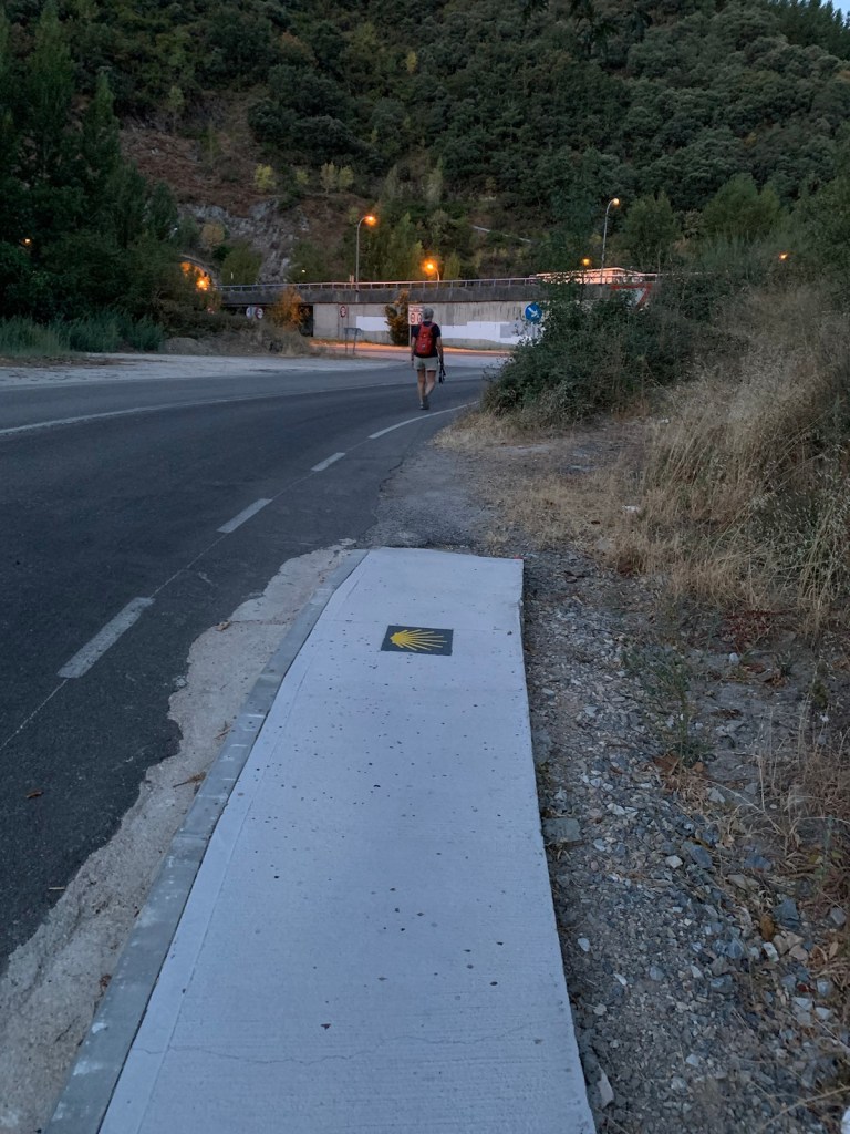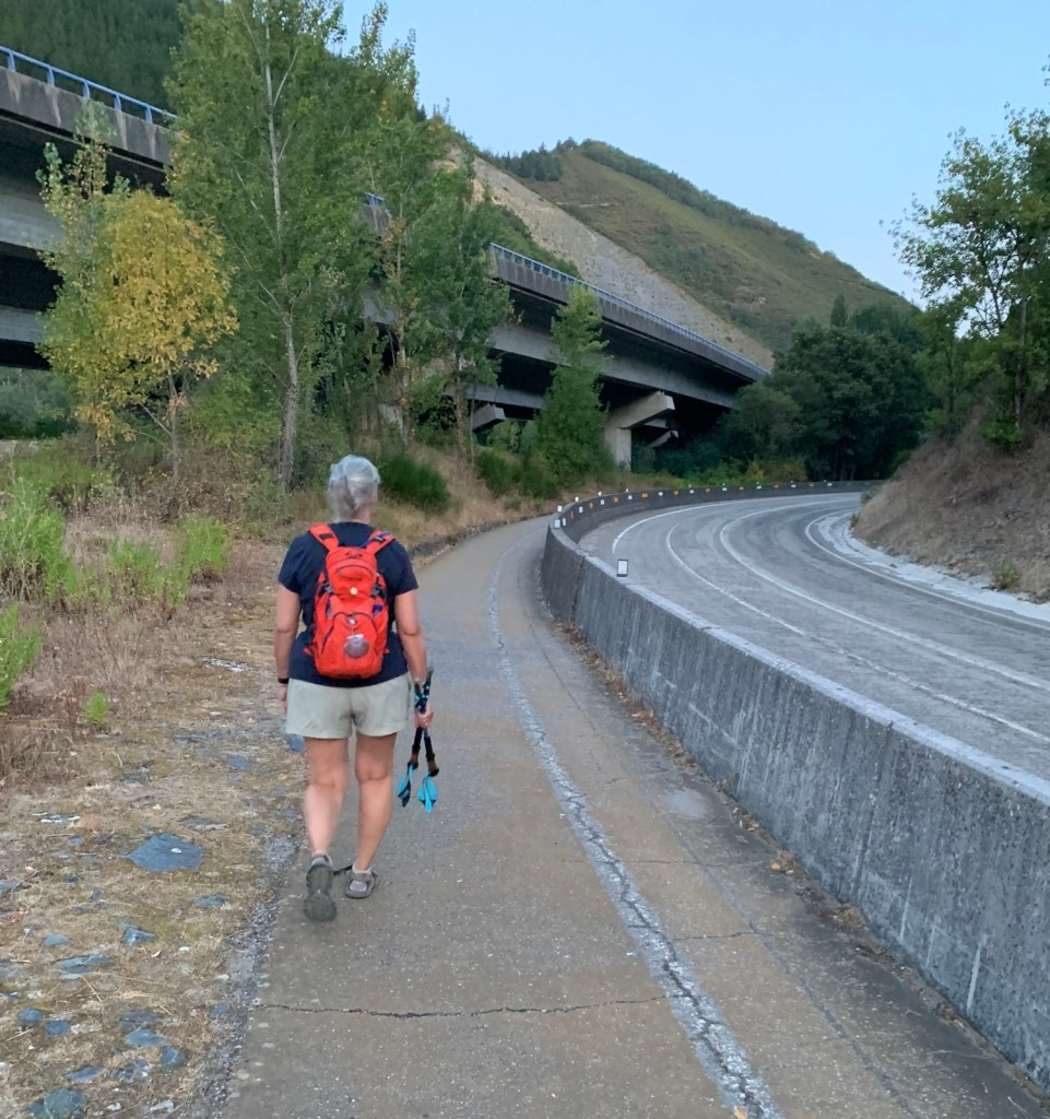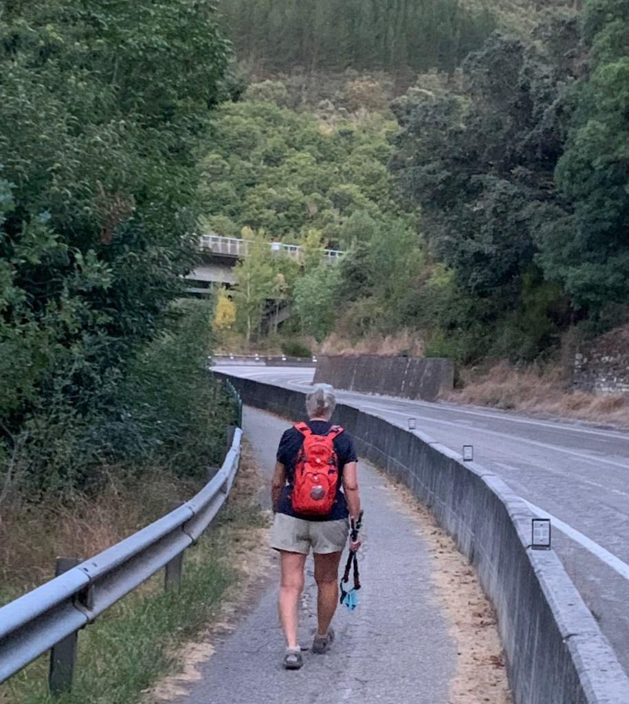 Walking out the front gate of Viña Femita at 6:45.Villafranca del Bierzo is a charming, historic but well maintained town… even in the dark.a modern (1999) pilgrim statue on the bridge leaving Villafranca.color and silhouettes of Villafranca at first lightA new sidewalk for pilgrims has been added since our last Camino, making for a safer way up through the mountain gap.the new walk ended after half-a-mile at the junction of the secondary road and the auto viatunnel through the mountain to the leftthe Camino taking us along the national highway with a crash barrier for pilgrim protectionwinding our way through the gap along the national highway and occasional overpasses of the autovia.more of the same for most of this morning’s walk the gap is about 1500 feet below the surrounding mountains, but still around 1600 ft above sea level.The entrance to Perejé (pop. 39) suggested this small hamlet might have re-opened a favorite breakfast stop at the halfway point of the Villafranca to Trabadelo walk… which has been closed since the pandemic. The disappointment continued today as the cerrado (closed) sign was still on the front door and the chairs/tables across the street were still chained up, preventing use.the stacked logs tells us we are nearing the saw mill in Trabadelo and we walked among the 400 year old chestnut tree forest.walking into Trabadelo and our albergue dominance of both sides of the road.entrances of Bar/ restaurant/ albergerelatively new addition of private rooms and owner’s residenceview of our building from rearthe double windows on ground floor is our room, overlooking the poolinteriors of our double room, retro decor1950’s decor, typical of many Camino “habitacions”