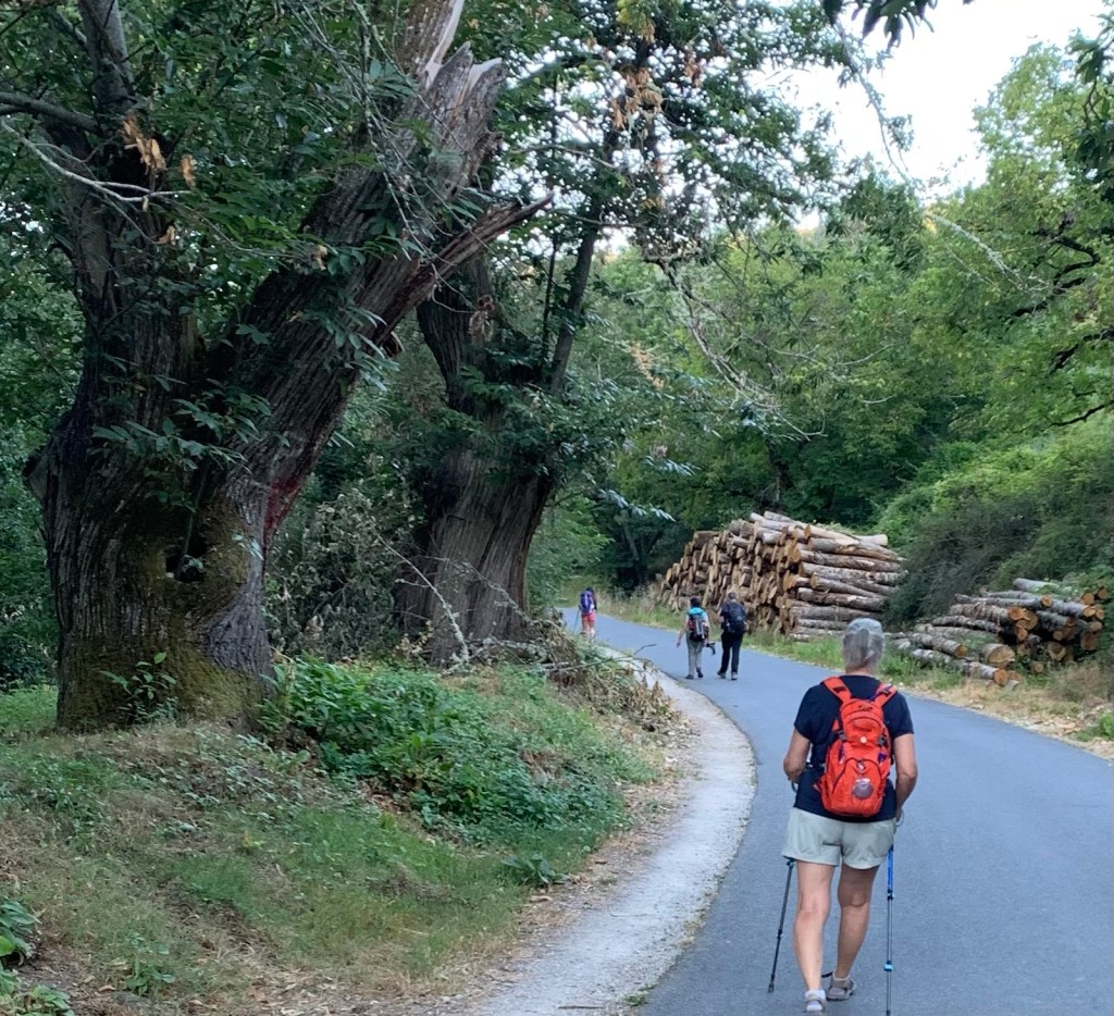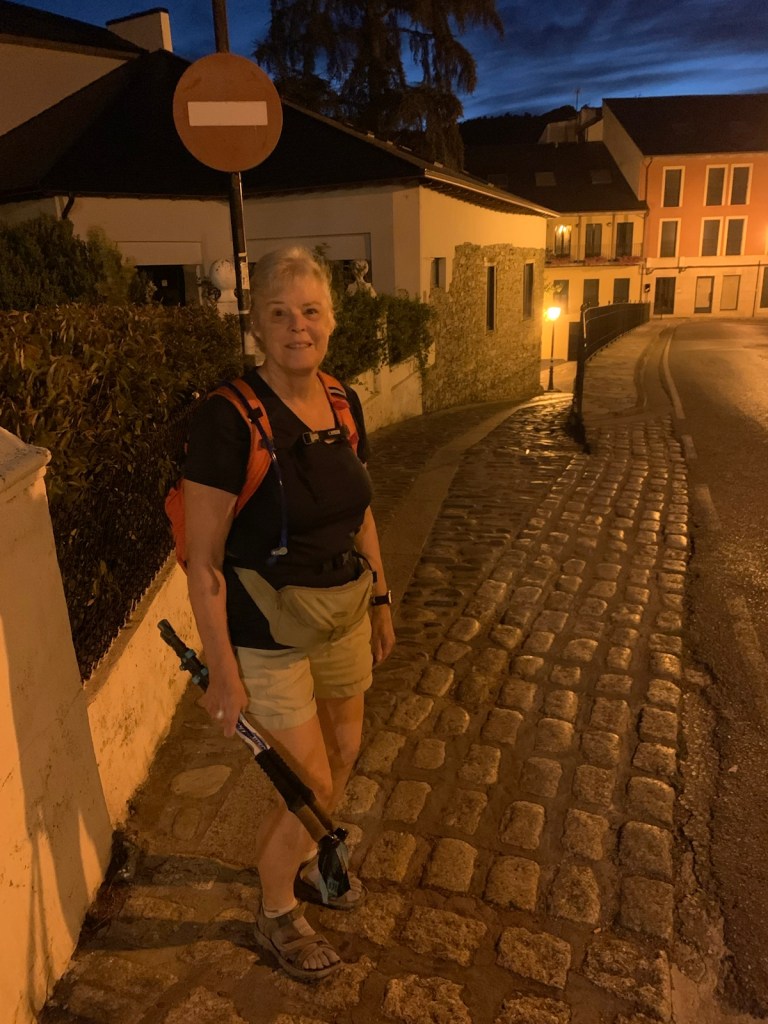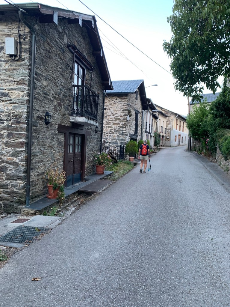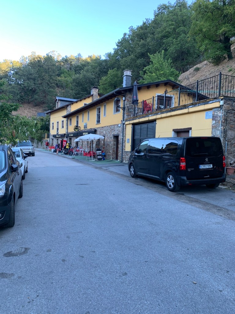 Walking out the front gate of Viña Femita at 6:45.Villafranca del Bierzo is a charming, historic but well maintained town… even in the dark.a modern (1999) pilgrim statue on the bridge leaving Villafranca.color and silhouettes of Villafranca at first lightA new sidewalk for pilgrims has been added since our last Camino, making for a safer way up through the mountain gap.the new walk ended after half-a-mile at the junction of the secondary road and the auto viatunnel through the mountain to the leftthe Camino taking us along the national highway with a crash barrier for pilgrim protectionwinding our way through the gap along the national highway and occasional overpasses of the autovia.more of the same for most of this morning’s walk the gap is about 1500 feet below the surrounding mountains, but still around 1600 ft above sea level.The entrance to Perejé (pop. 39) suggested this small hamlet might have re-opened a favorite breakfast stop at the halfway point of the Villafranca to Trabadelo walk… which has been closed since the pandemic. The disappointment continued today as the cerrado (closed) sign was still on the front door and the chairs/tables across the street were still chained up, preventing use.the stacked logs tells us we are nearing the saw mill in Trabadelo and we walked among the 400 year old chestnut tree forest.walking into Trabadelo and our albergue dominance of both sides of the road.entrances of Bar/ restaurant/ albergerelatively new addition of private rooms and owner’s residenceview of our building from rearthe double windows on ground floor is our room, overlooking the poolinteriors of our double room, retro decor1950’s decor, typical of many Camino “habitacions”