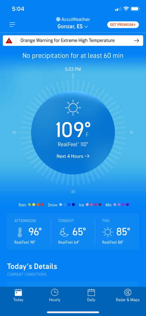 Update: the 98F forecast was way off. We’re in the restaurant where the AC is much cooler than our non-AC room. It’s 109F outside!!! A record for this area.