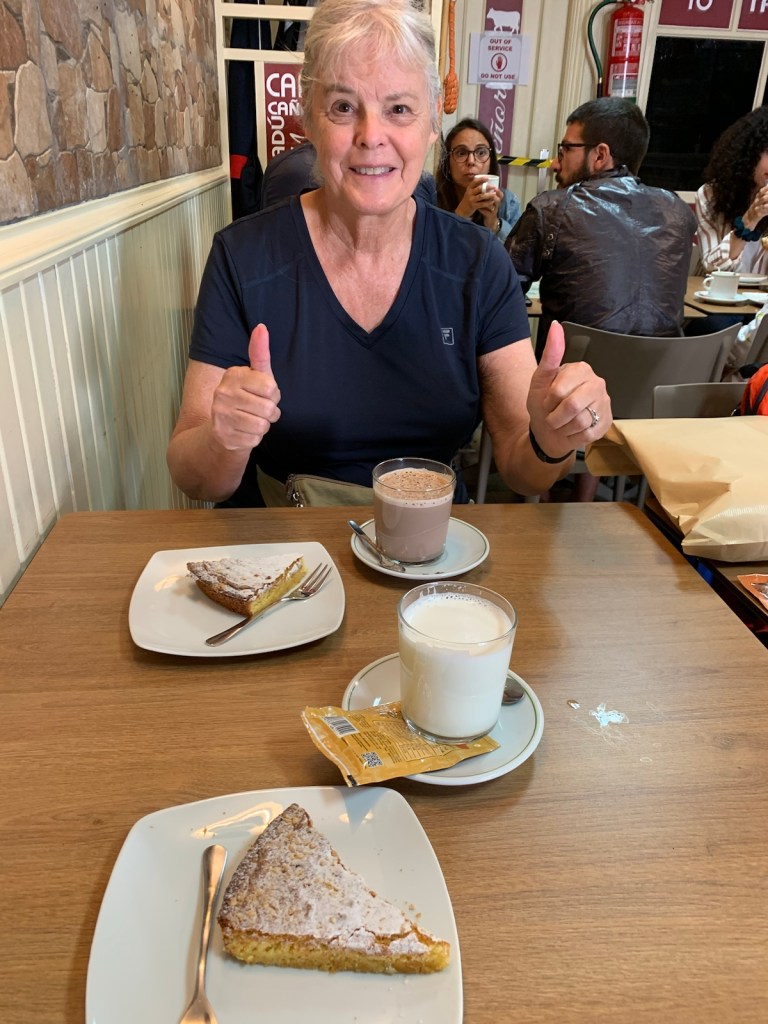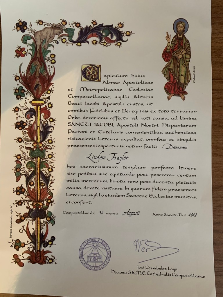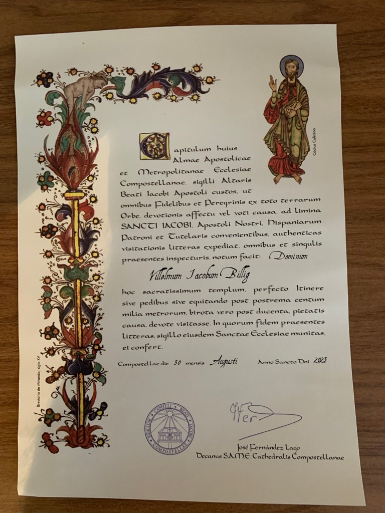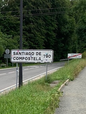 Linda’s CompostelaJim’s CompostelaHaving our celebratory Hot Chocolate and Santiago cake after receiving our compostelas.Crowd building some since we walked in a half-hour ago.This is look at the Catedral from another angle.The Platerias Facade, where pilgrims typically enter the Catedral. Note the line up the steps.We thought the sign behind us was interesting showing we were in (zero km ) Santiago. 49 days ago we observed a similar sign in Roncesvalles, having just walked over the Pyrenees.July 13, 2023 … leaving Roncesvalles.