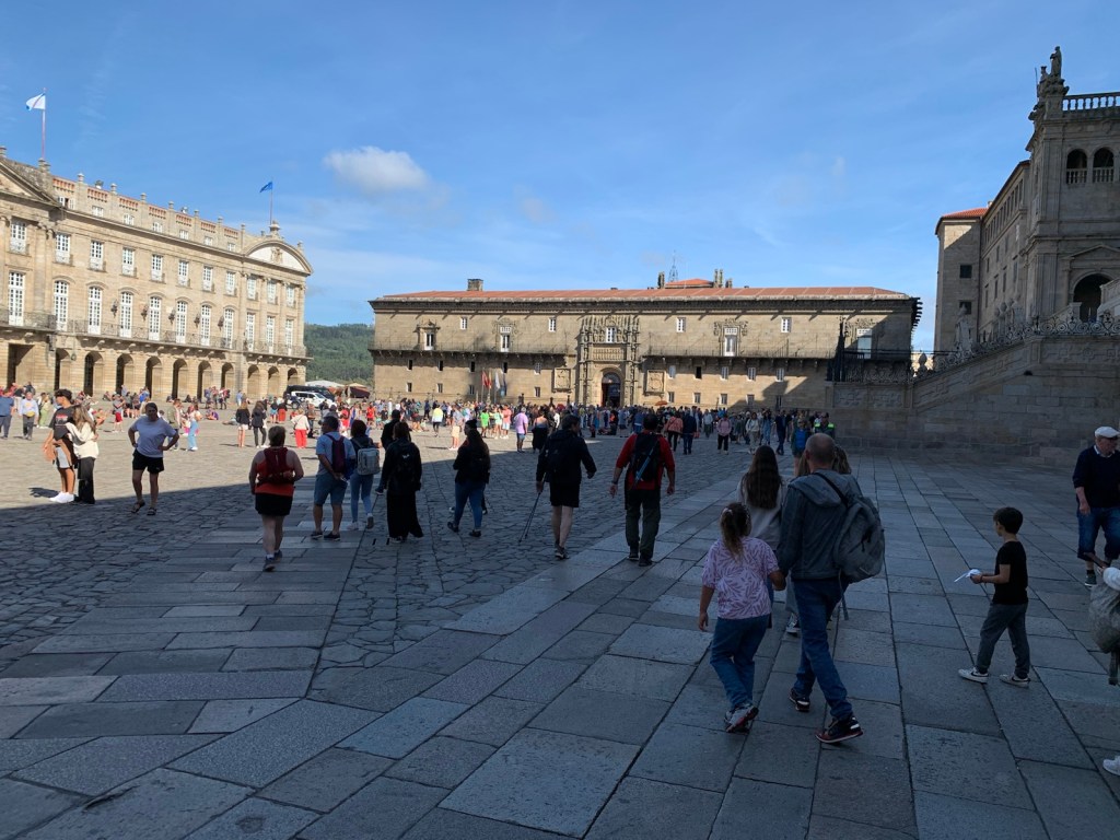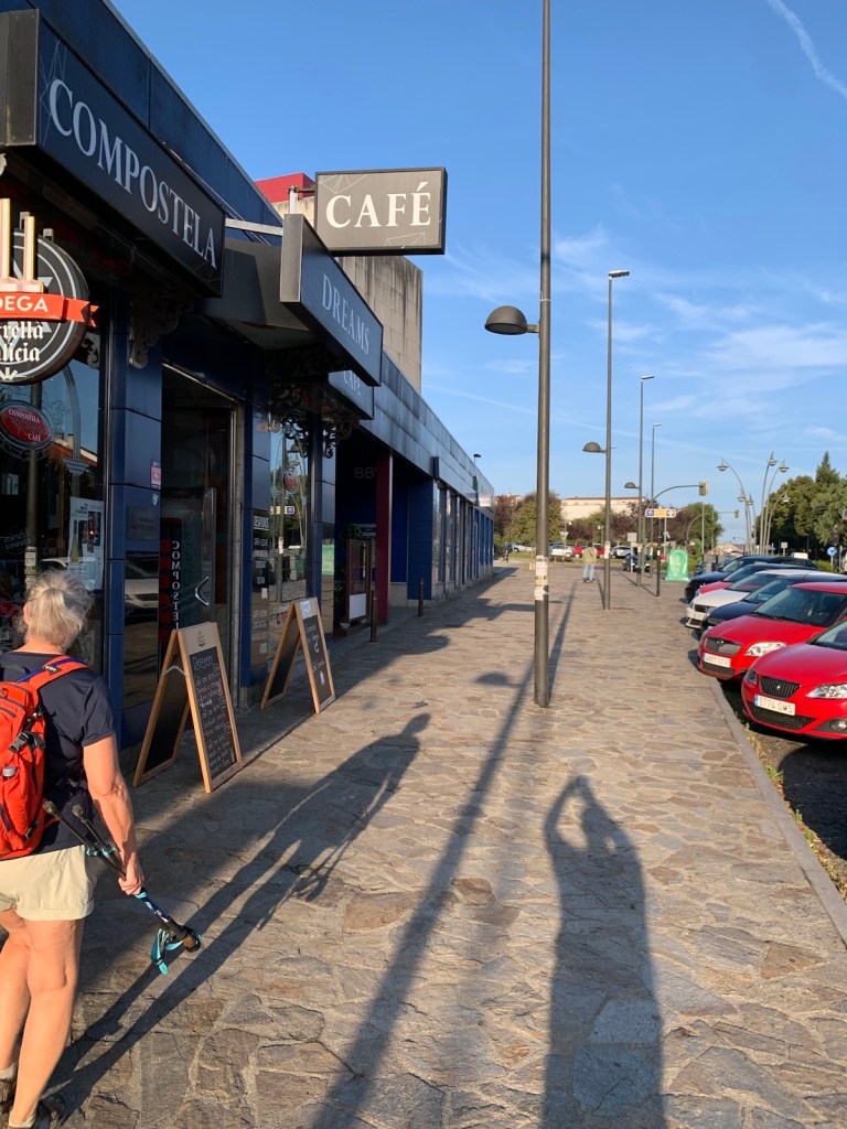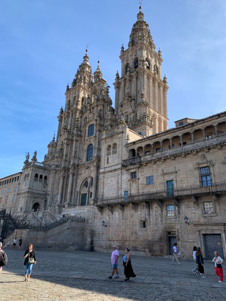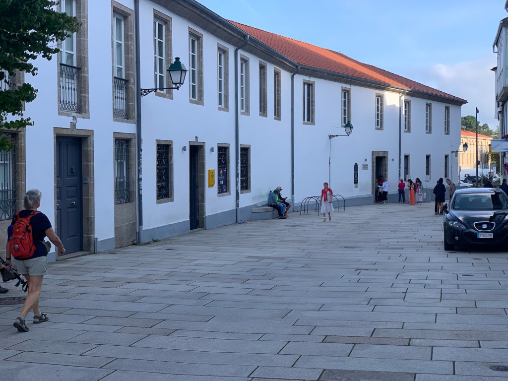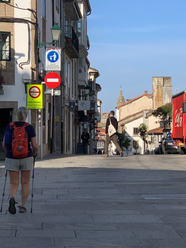 As you can see, or not, we started out at O’Dark:30 Here we are an hour into our walk, no longer in the dark and continuing our walk on pavement.We had breakfast at this modern bar/restaurant just as we entered San Marcos. There were only 6 pilgrims when we arrived and still just 4 pilgrims when we left. Virtually no crowding.Walking into San Marcos , we were almost alone.We’re walking down from Monte de Gozo, our last hill on the Camino. A huge complex is off to our left that has some 50 ugly concrete barracks and other support facilities for athletes attending nearby sports camps.This bridge was built several years ago to safely allow pilgrims to enter the city with the growing traffic and new expressways. In 2022, this bridge was packed with hoards of young pilgrims heading into the city… today it was just us and 5-6 pilgrims way up ahead.Crossing the expressway and heading into San Lazáro, a suburb of Santiago.Walking into San LazároLots of bars open this morning at 9:00 but only a few pilgrims.Some residential areas in Santiagomore residential and shops in modern SantiagoOur first glimpse of the Catedral towers as we entered the old section of Santiago.a picturesque plaza just before getting to the Catedral.We’ve stayed in this albergue in 2017 and 2019. Our room was one with a balcony and we watched pilgrims walk to the Catedral as we did today.Walking pastA view of Praza de Obradoiro, as empty as we have ever seen it.The western facade of the Catedral which faces the Praza de Obradoiro.This is the pilgrim’s office only 5 minutes walk from the Catedral. Only 5 pilgrims waiting at the door to go in to present their credentials yo qualify for the Compostela.