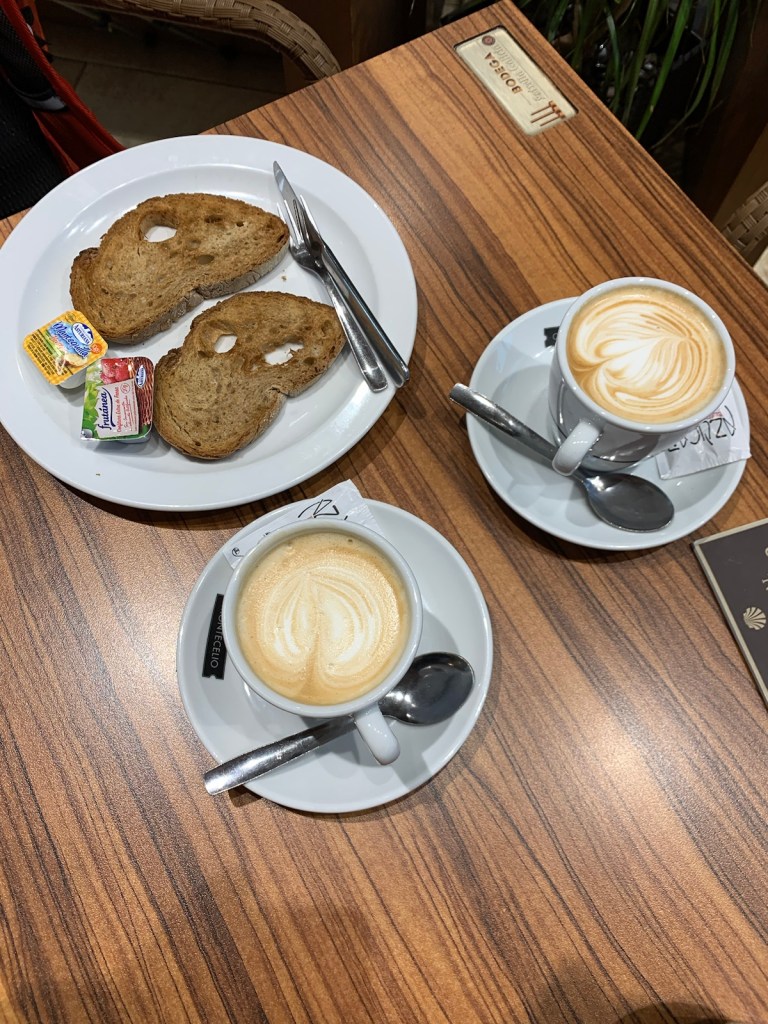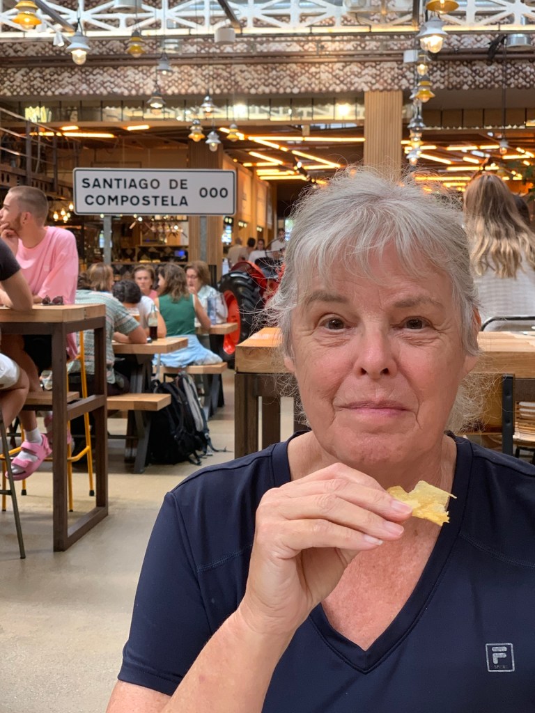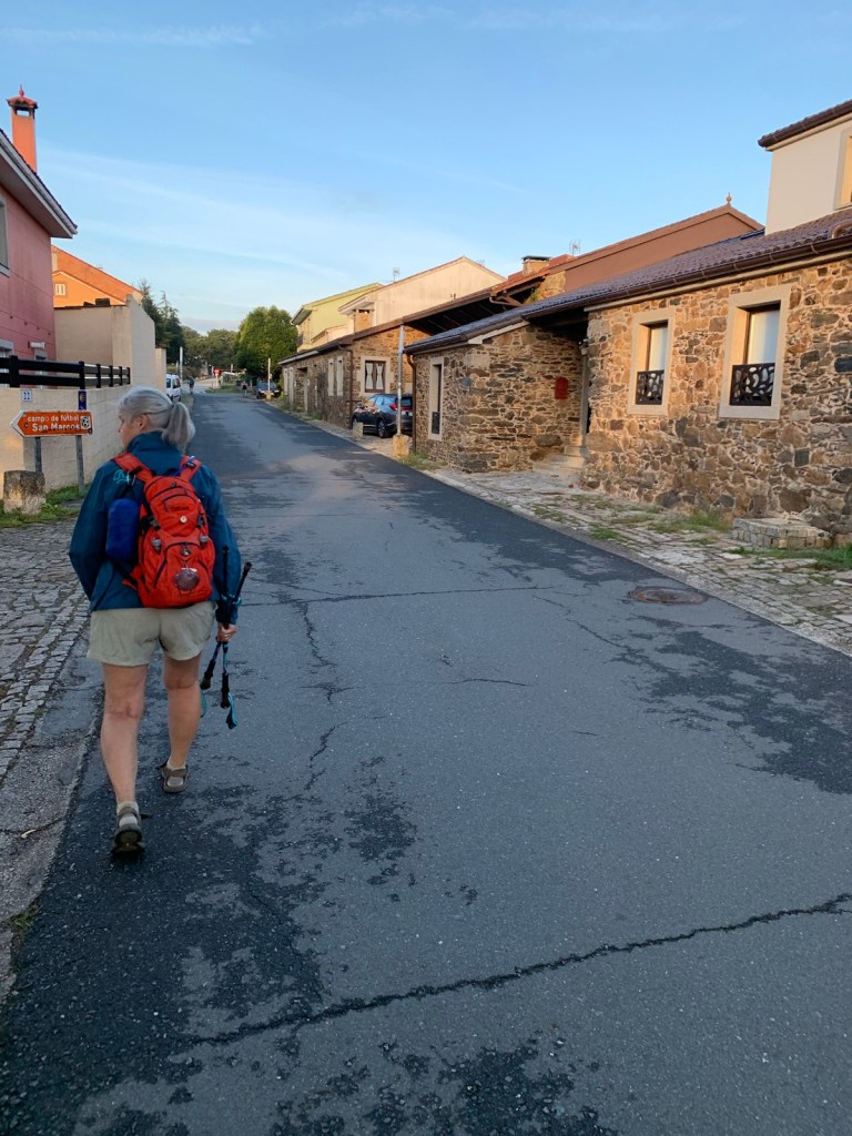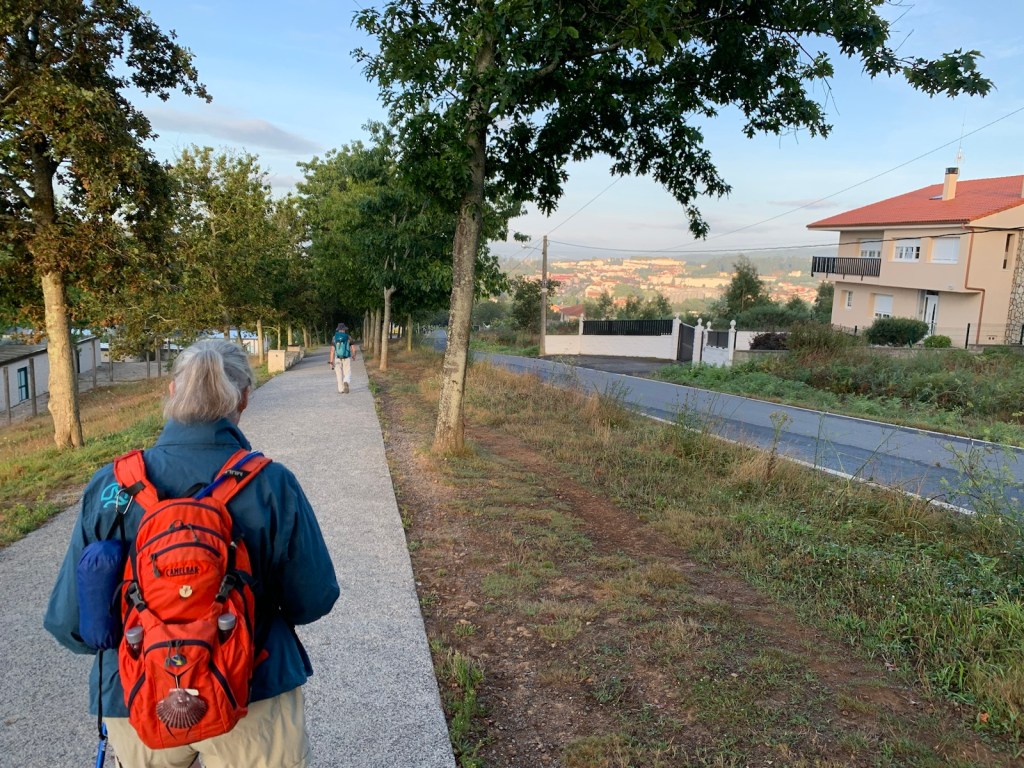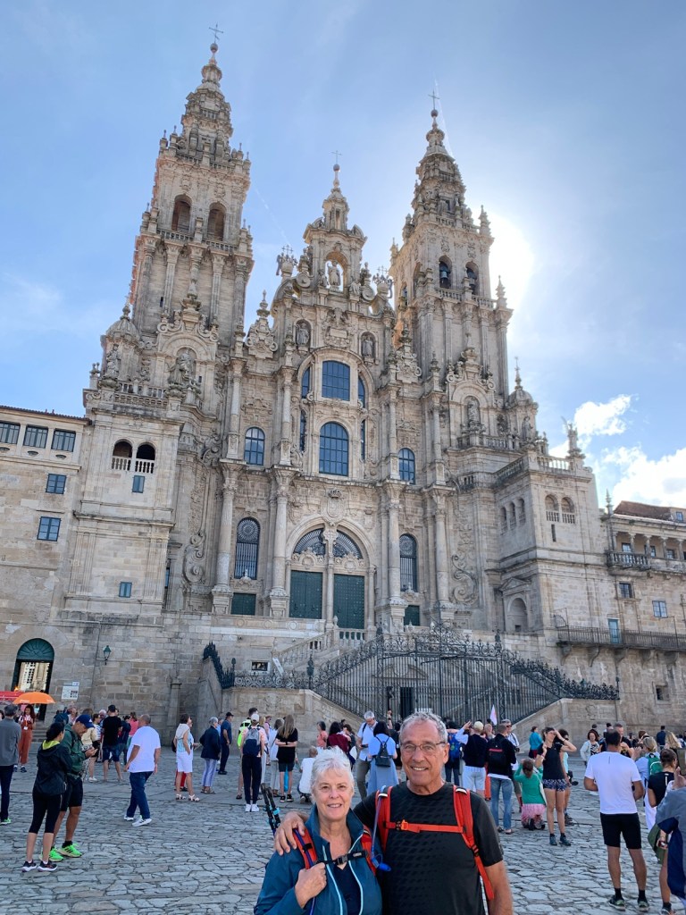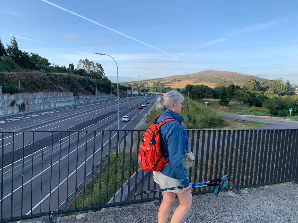 As you can see, or not, we started out at O’Dark:30 Here we are an hour into our walk, no longer in the dark and continuing our walk on pavement.We had breakfast at this modern bar/restaurant just as we entered San Marcos. There were only 6 pilgrims when we arrived and still just 4 pilgrims when we left. Virtually no crowding.Walking into San Marcos , we were almost alone.We’re walking down from Monte de Gozo, our last hill on the Camino. A huge complex is off to our left that has some 50 ugly concrete barracks and other support facilities for athletes attending nearby sports camps.This bridge was built several years ago to safely allow pilgrims to enter the city with the growing traffic and new expressways. In 2022, this bridge was packed with hoards of young pilgrims heading into the city… today it was just us and 5-6 pilgrims way up ahead.Crossing the expressway and heading into San Lazáro, a suburb of Santiago.Walking into San LazároLots of bars open this morning at 9:00 but only a few pilgrims.Some residential areas in Santiagomore residential and shops in modern SantiagoOur first glimpse of the Catedral towers as we entered the old section of Santiago.a picturesque plaza just before getting to the Catedral.We’ve stayed in this albergue in 2017 and 2019. Our room was one with a balcony and we watched pilgrims walk to the Catedral as we did today.Walking pastA view of Praza de Obradoiro, as empty as we have ever seen it.The western facade of the Catedral which faces the Praza de Obradoiro.This is the pilgrim’s office only 5 minutes walk from the Catedral. Only 5 pilgrims waiting at the door to go in to present their credentials yo qualify for the Compostela.