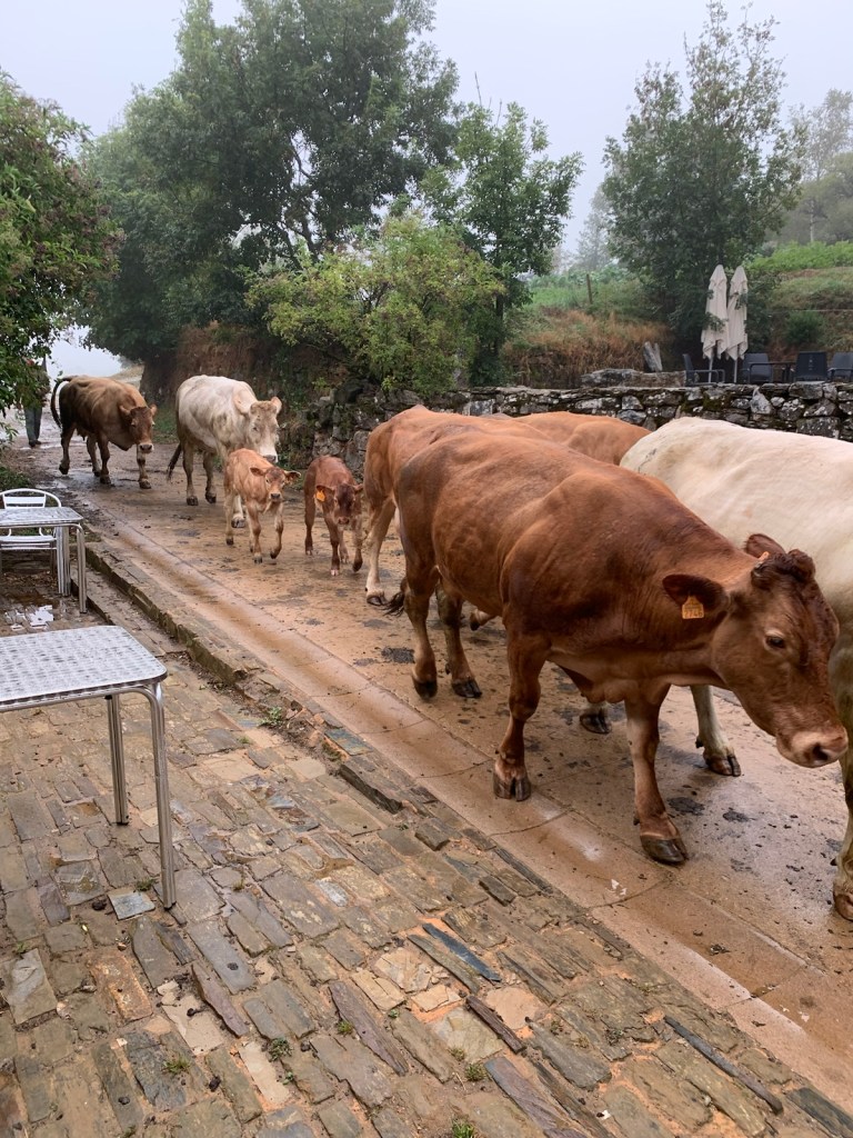 We had cafe con leche at Casa Lucas for breakfast, so we went for our next favorite morning drink.the smallest church on the Camino, or so they say. A traffic jam (for vehicles and pilgrims) on main street in Biduedo as cattle are moved from the barn (for milking) back to pasture.how about this view out your barn door
