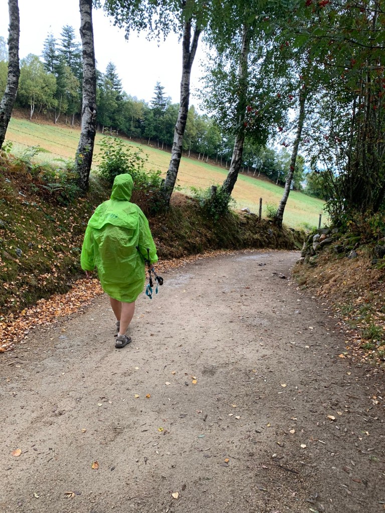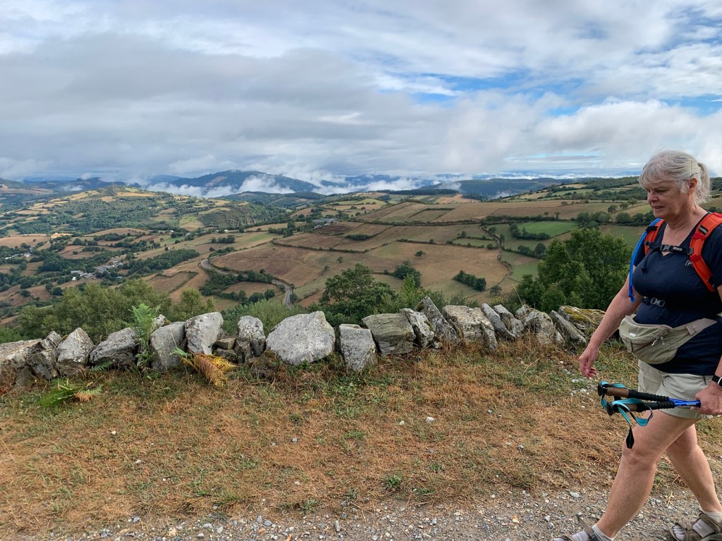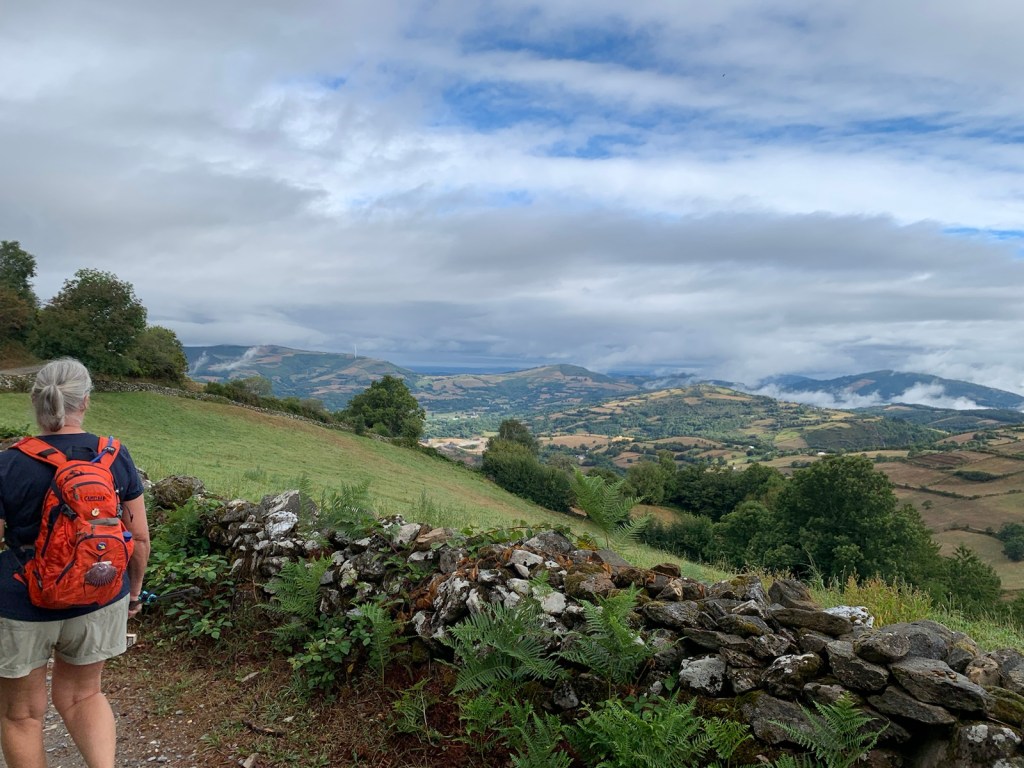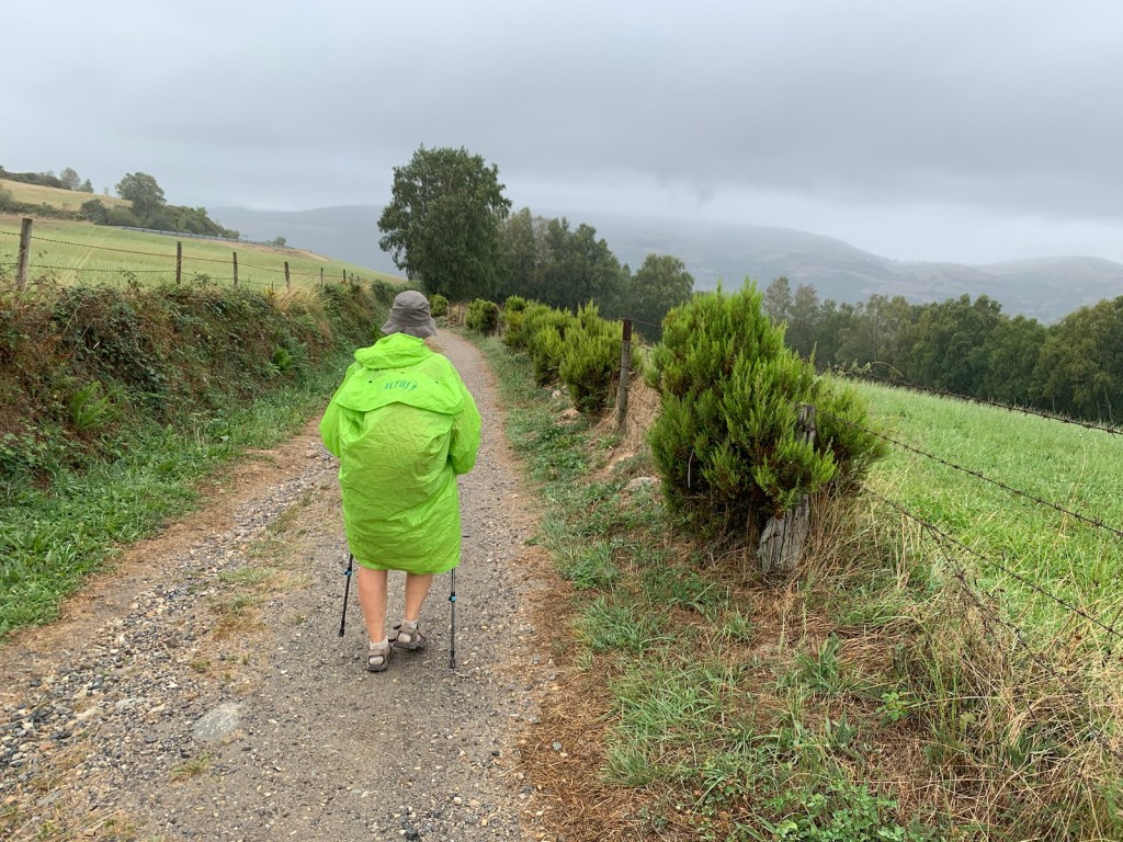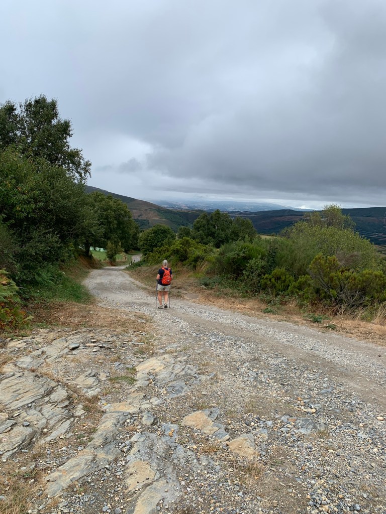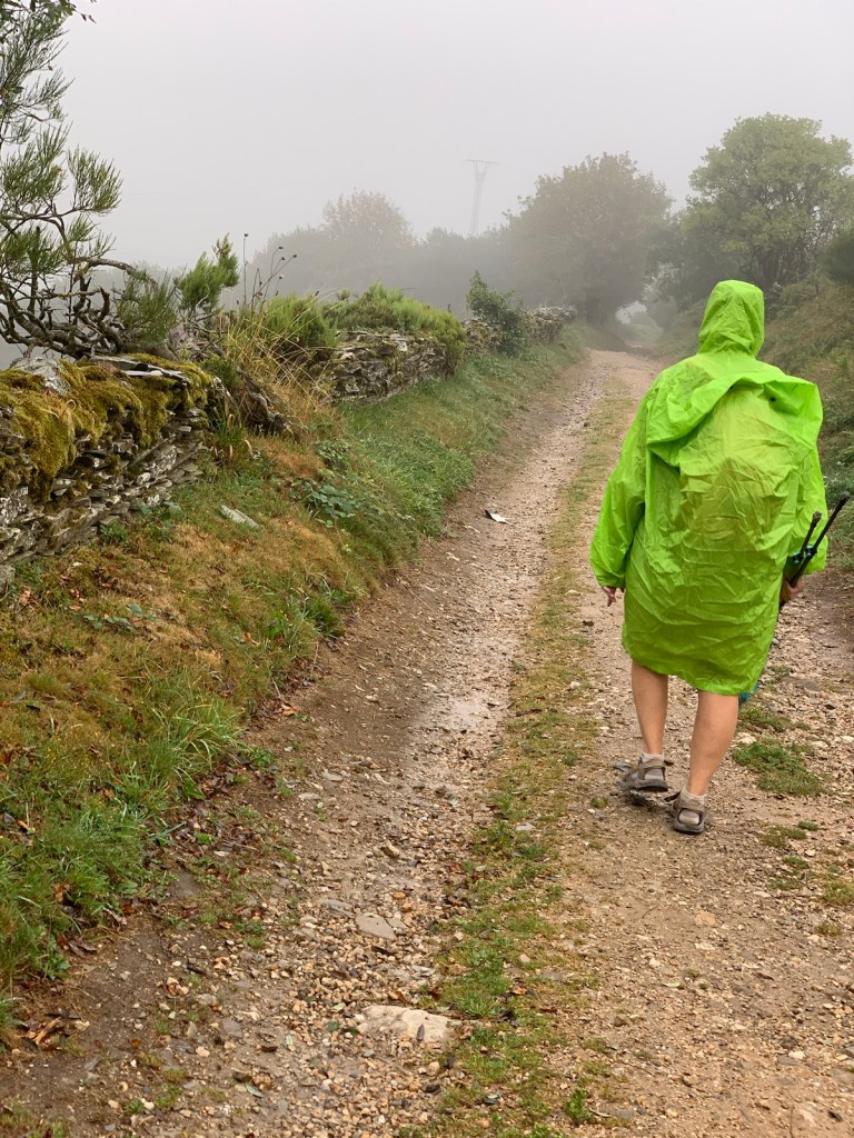 Some of the most incredible views on the Camino Frances.breathtaking views of the landscape over 1000 feet belowa span of nearly 270 degrees of sceneryapproaching the downward pathclouds moving in and blocking out the sunputting the ponchos back on as the clouds continued to move init began to drizzle as we continued our descent and turned into a rain shower as we reached Fillobal.