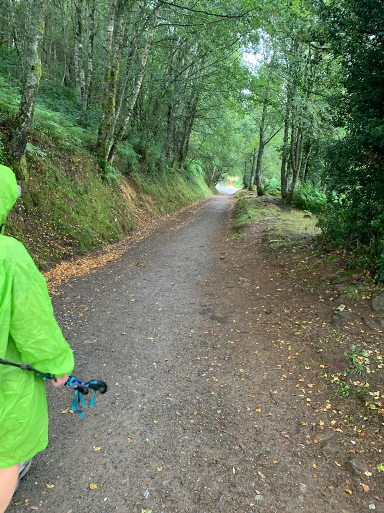 leaving Bar Gonzar in Portomarin at 7:30… heading out of Portomarin to go toward Gonzar along with other pilgrimsbeginning the relatively steep, 1.5 mile incline up the mountain after the bridge leaving Portomarin.high pilgrim traffic, but typicalnear the top of the climb out of Portomarin at the top, tree-lined path leveled out and allowed faster pilgrims to put distance between us. most of the walk was on a path on the shoulder of a secondary road, periodically changing sides of the pavement back on the dirt path again, we walked through several picturesque wooded areas and this section that was destroyed by a fire in 2019 but has recovered nicely in just 4 years.nice, shady walk through this wooded section